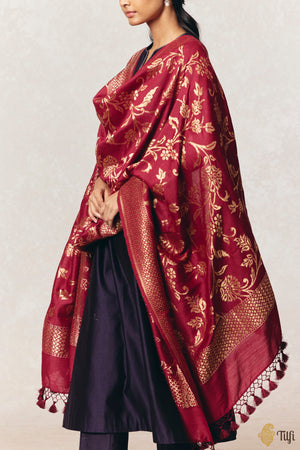 A light and versatile Banarasi dupatta with an all-over pattern of fluid vines and varying floral blossoms handwoven in gold zari.