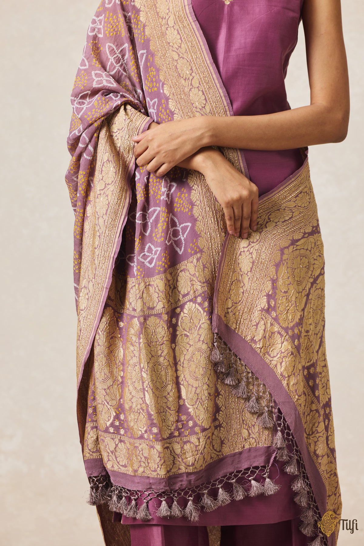 Collection note - Seeking inspiration from India’s rich and varied regions, Tilfi’s Bandhani dupattas are the perfect confluence of heritage textile traditions and Banarasi weaves. Handwoven in Banaras and hand-dyed in Kutch.