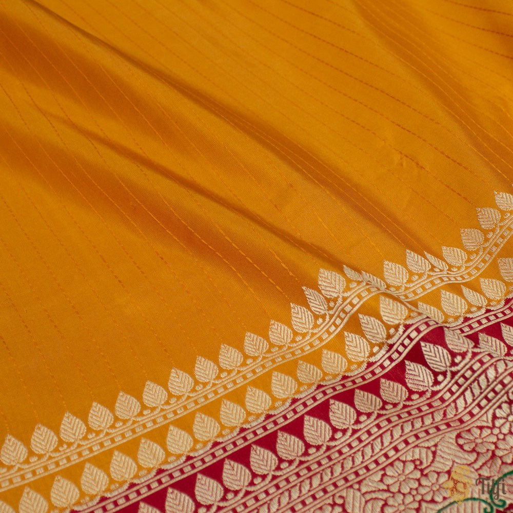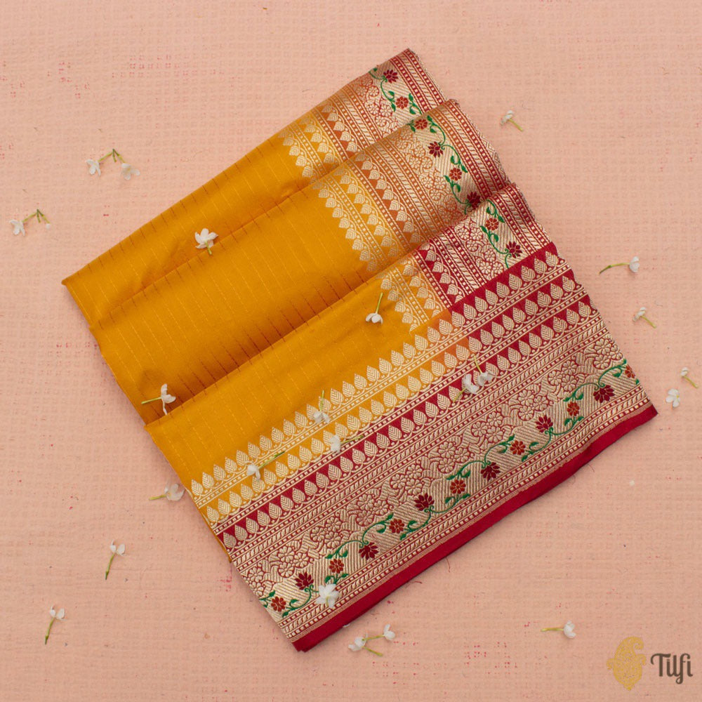 A delicate Banarasi classic with an old-world charm! It has a subtle striped weave and a gorgeous and intricate meenakari kadiyal border and pallu. Vintage inspirations, but a timeless appeal!