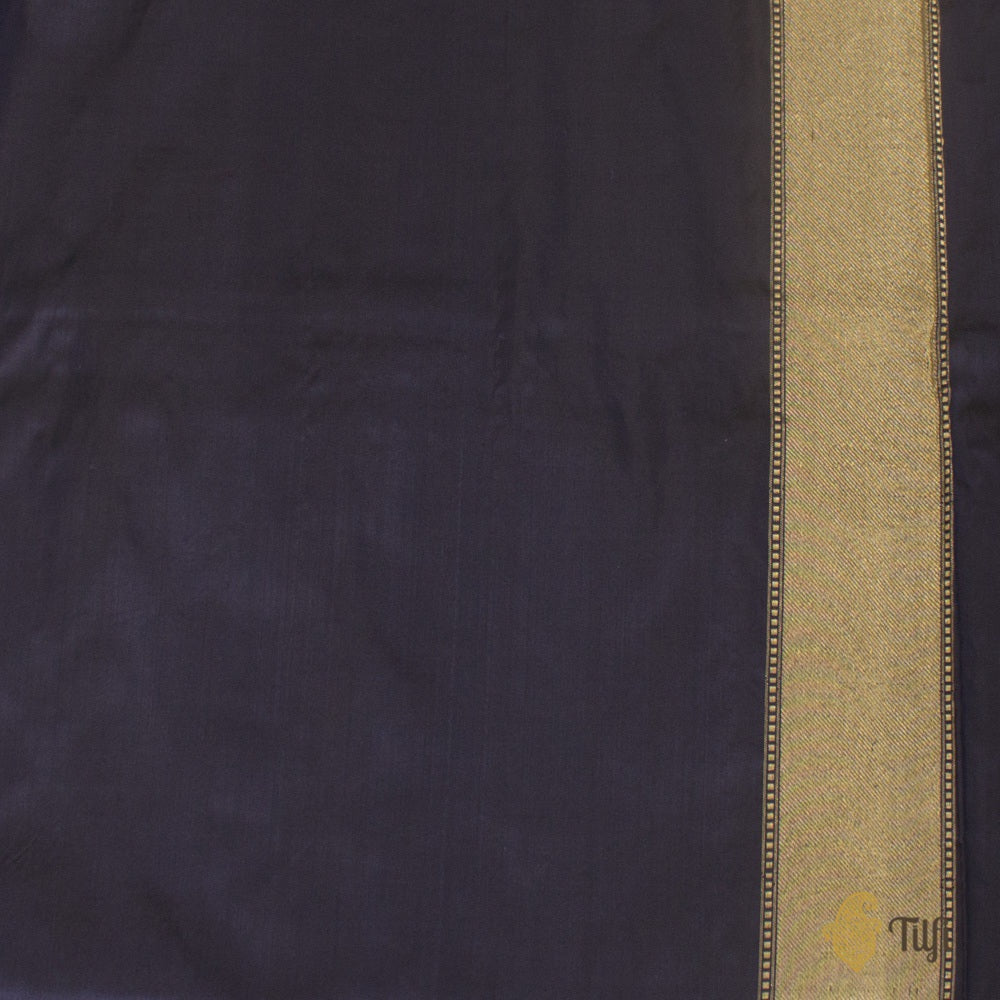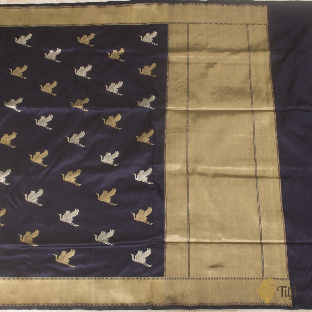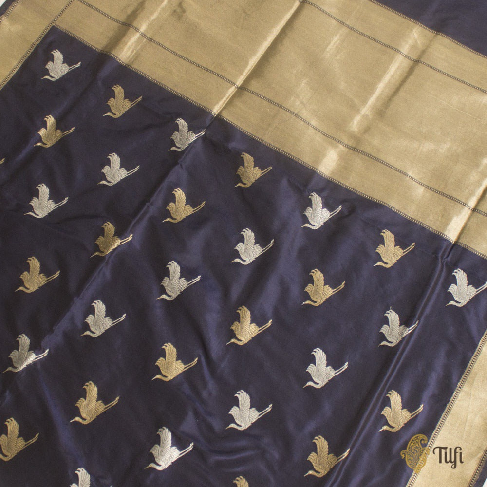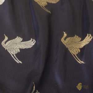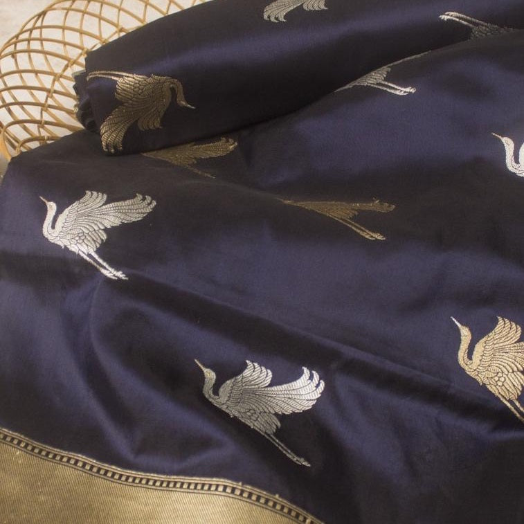 A glorious silken drape in the most chic of colours and joyful of patterns! Delightful “saaras” (crane) bird kadhua motifs all in flight with a beautiful hint of meenakari: the recipe of a striking ensemble.