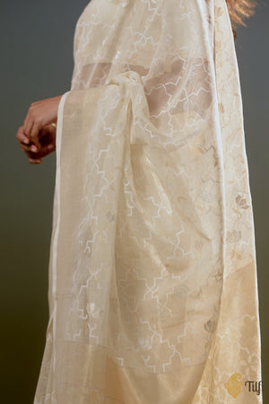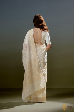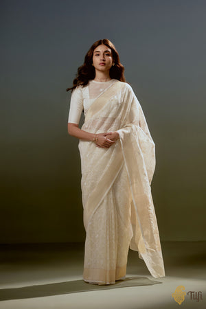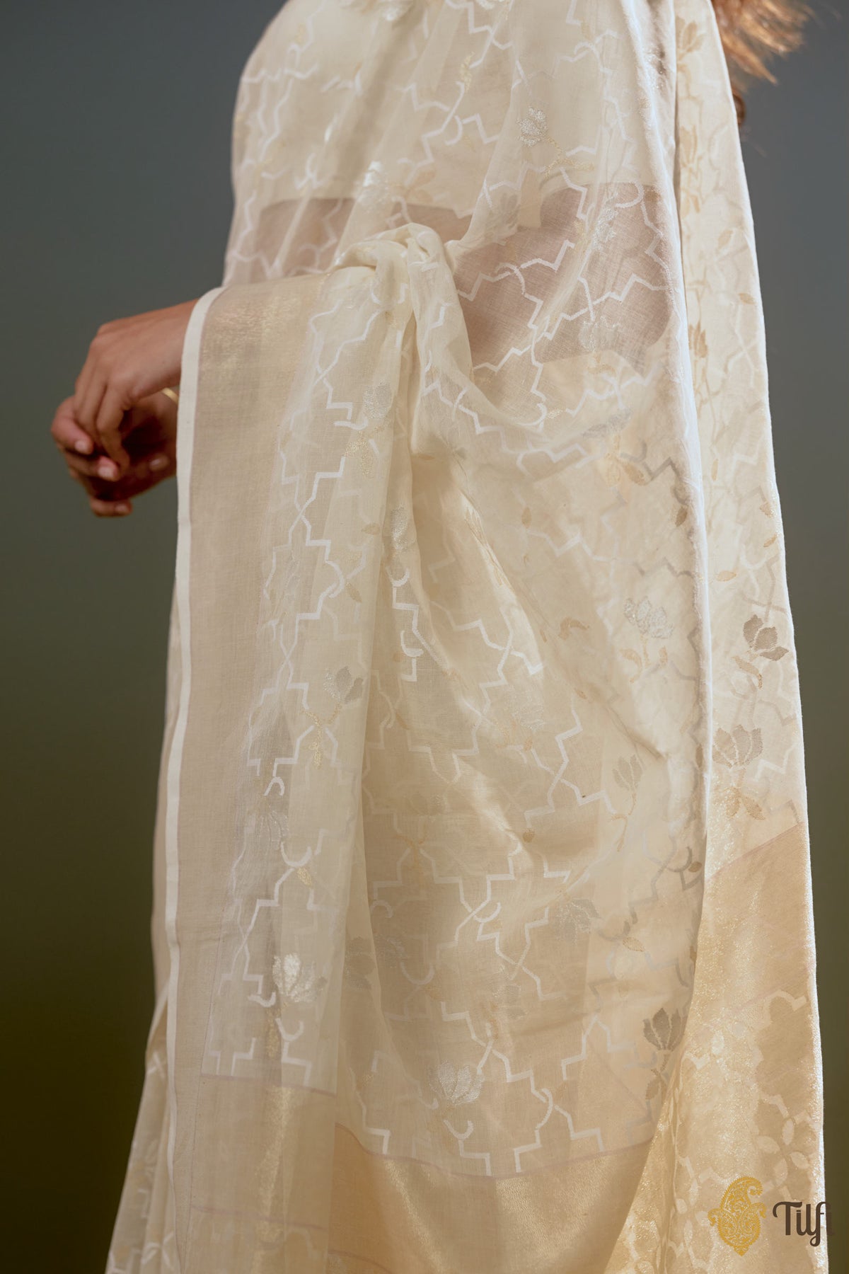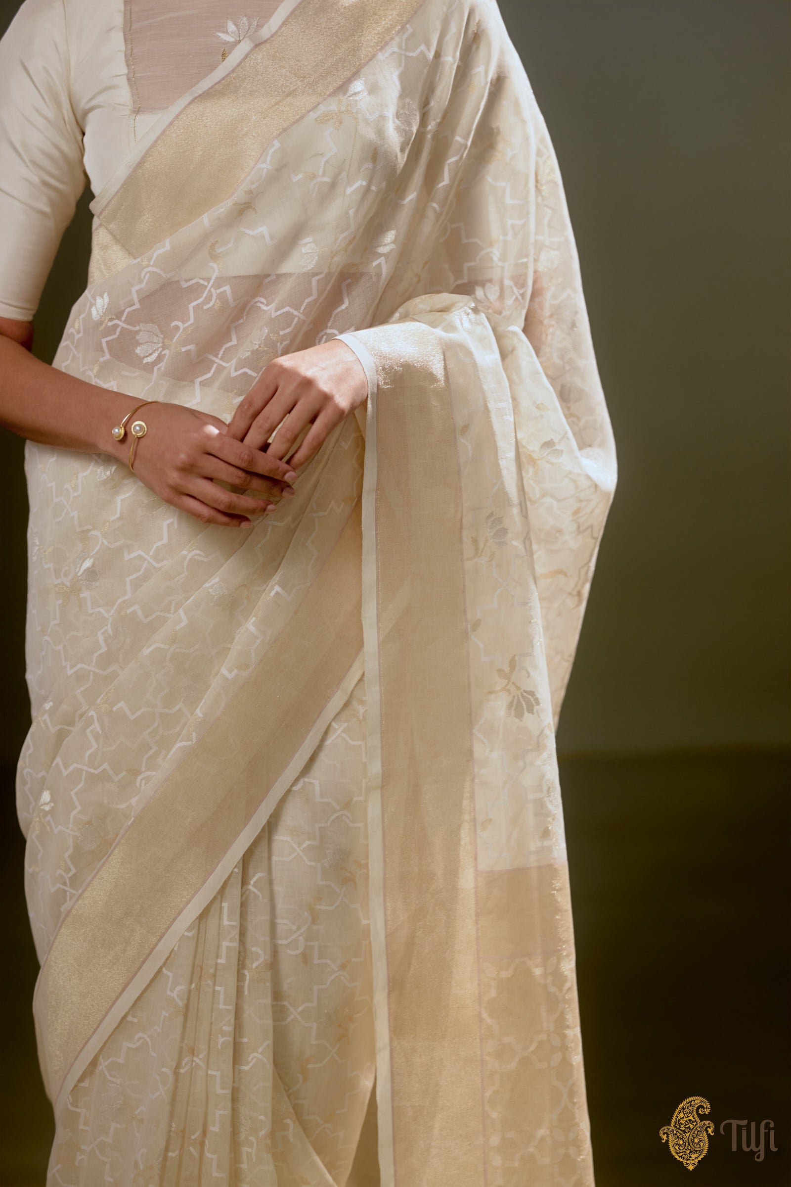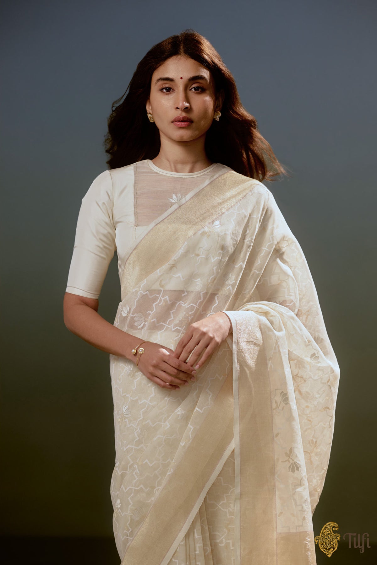 A finely woven Awadhi jamdani saree in pristine white where geometric shapes form an interconnected jaal, softened by delicate lotuses entwined within. Adorned with precise geometric detailing, it mirrors the measured symmetry of Mughal screens, balanced with a real zari border in gold - intricate yet weightless.