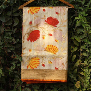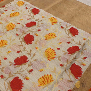 Raw and beautiful - so appealing in its textured appearance and perfect in its imperfections! This gorgeous saree is handwoven in beautiful Dupion silk with kadwa meenakari and a striking Golden zari border.