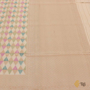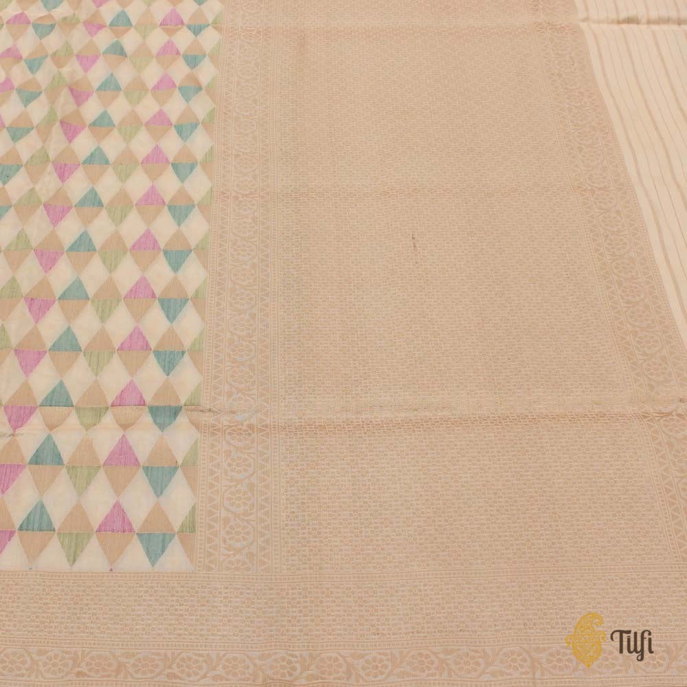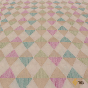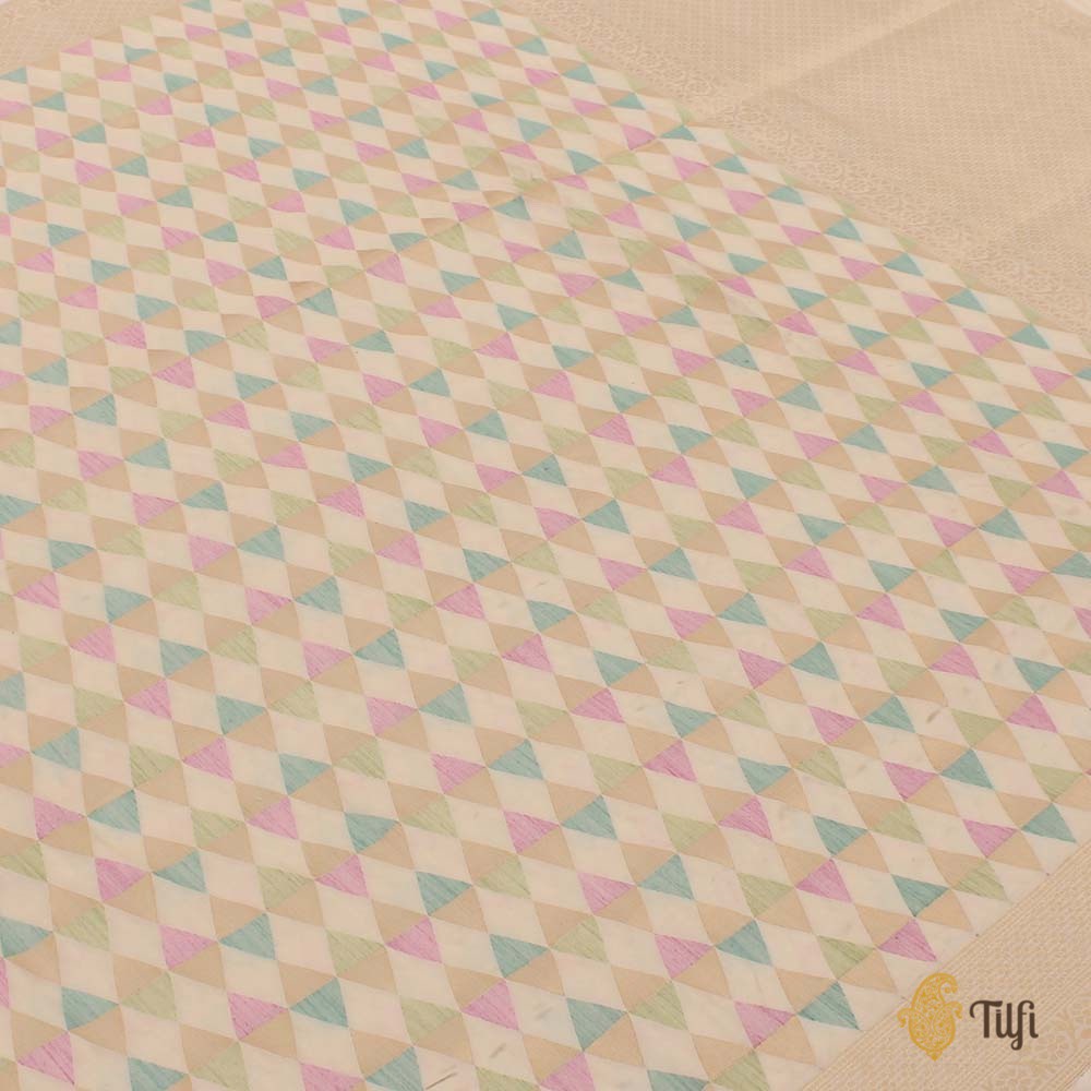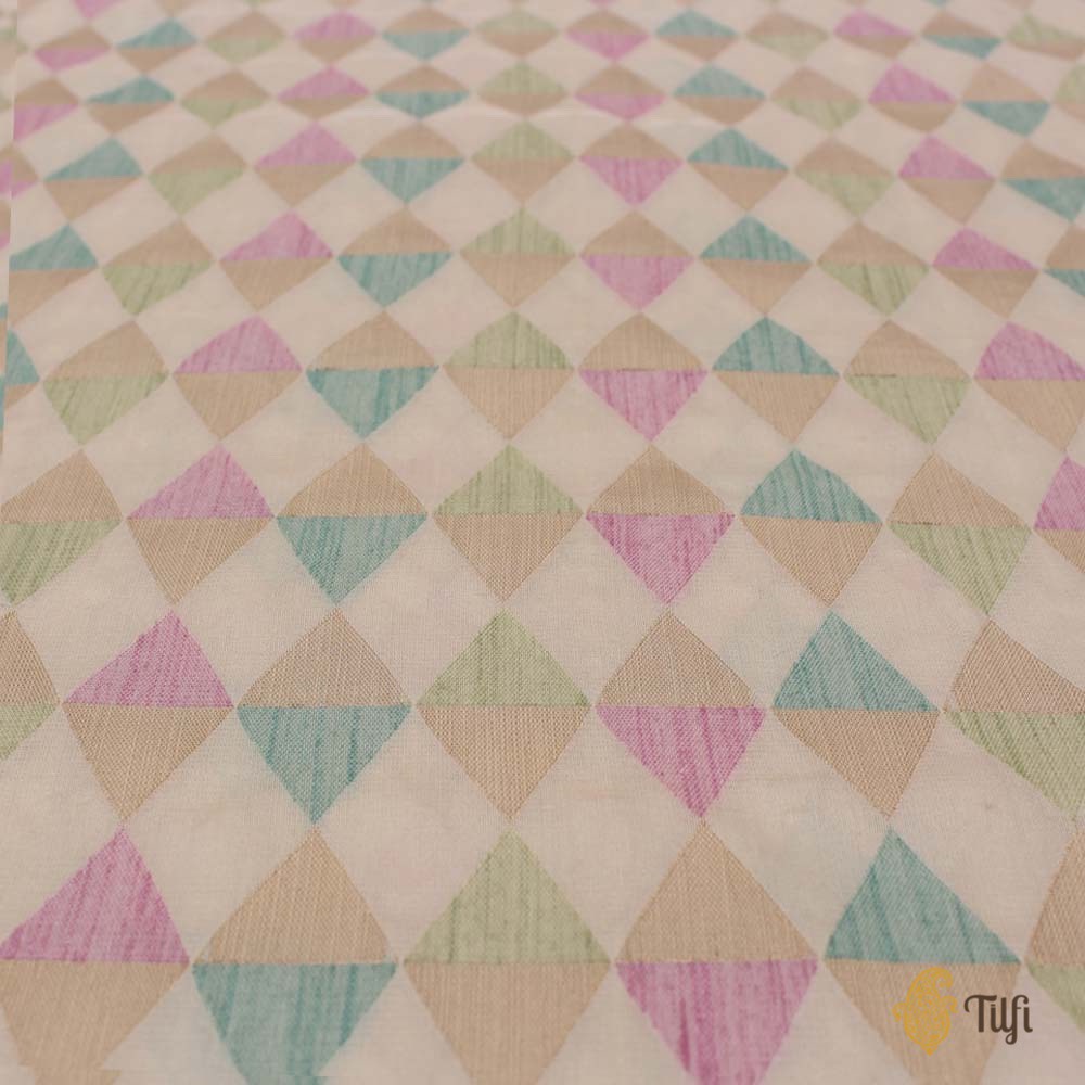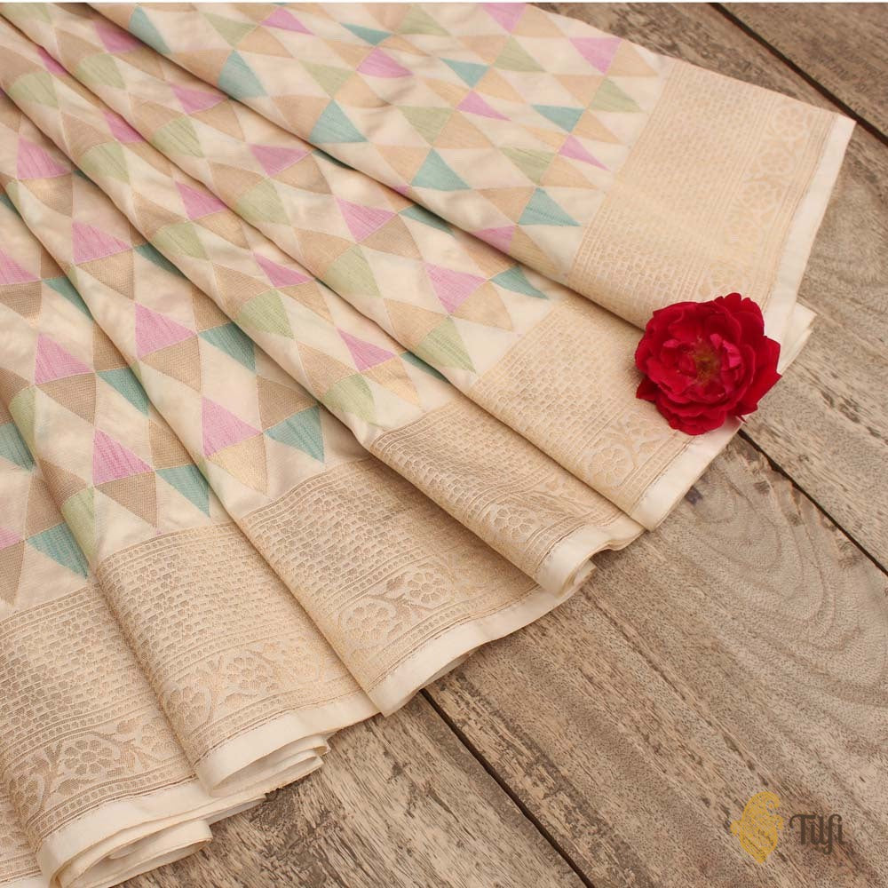For the urbane, worldly woman, proud and firmly rooted in India's heritage. A glorious handloom classic in a stunning melange of colours and fine katan silk - a contemporary geometric body, patterned with triangles crafted in pastel silk and gold zari.
