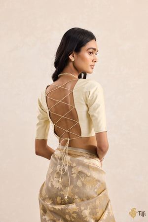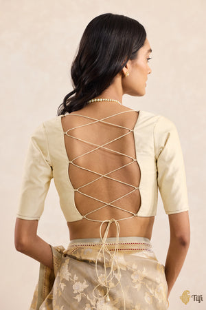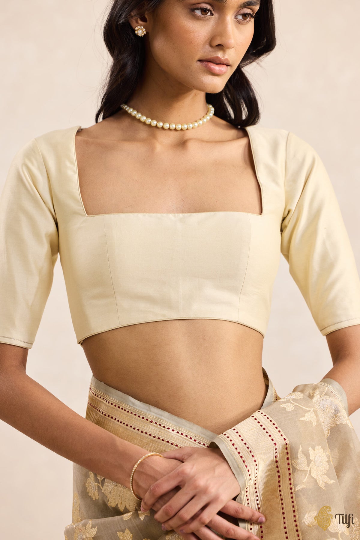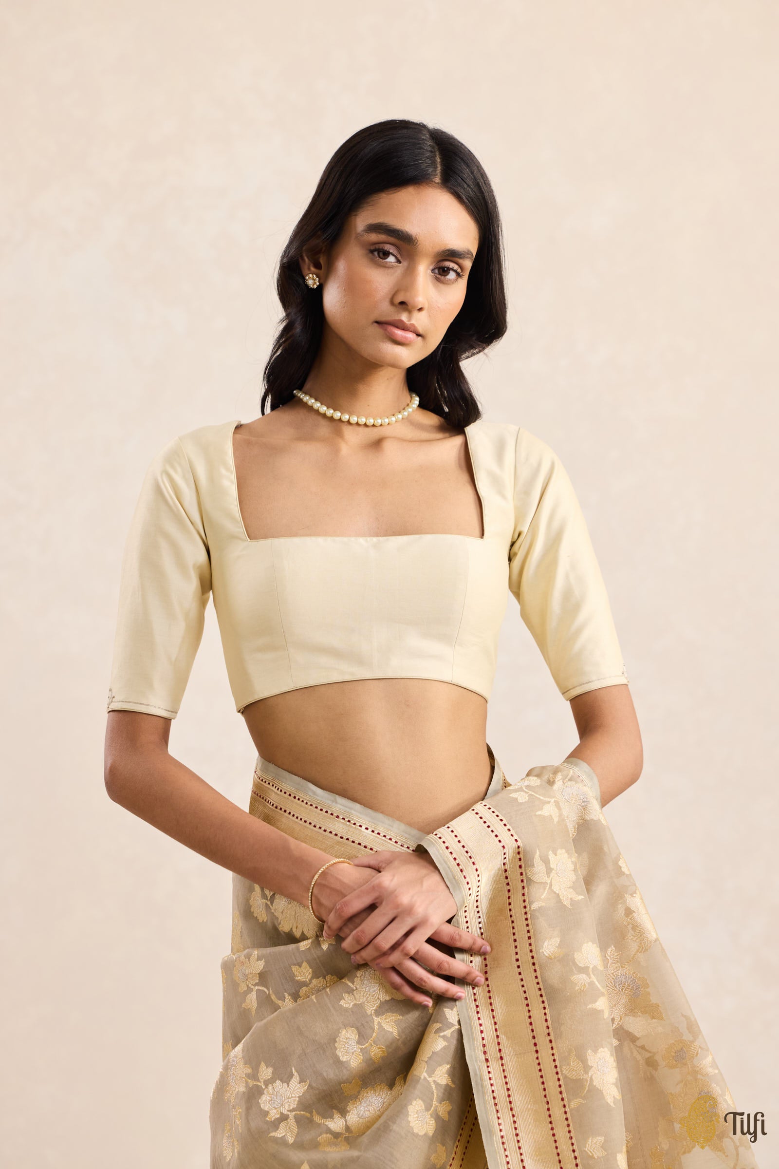 A versatile silk-cotton blouse crafted to complement Tilfi’s handwoven sarees. Designed with a square neckline, an adjustable criss-cross dori back, and delicate hand-embroidered zari details — including small, stylized Tilfi paisleys at the sleeve ends.