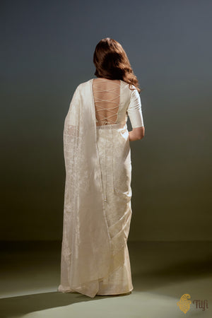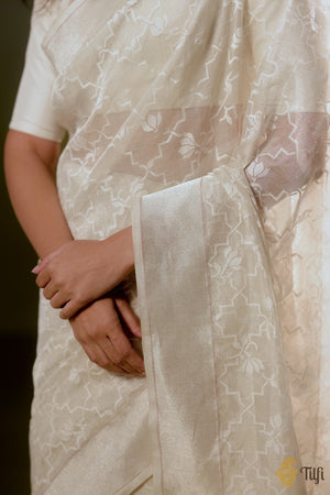 A finely woven Awadhi jamdani saree in pristine white where geometric shapes form an interconnected jaal, softened by delicate lotuses entwined within. Adorned with precise geometric detailing, it mirrors the measured symmetry of Mughal screens, balanced with a real zari border in silver - intricate yet weightless.