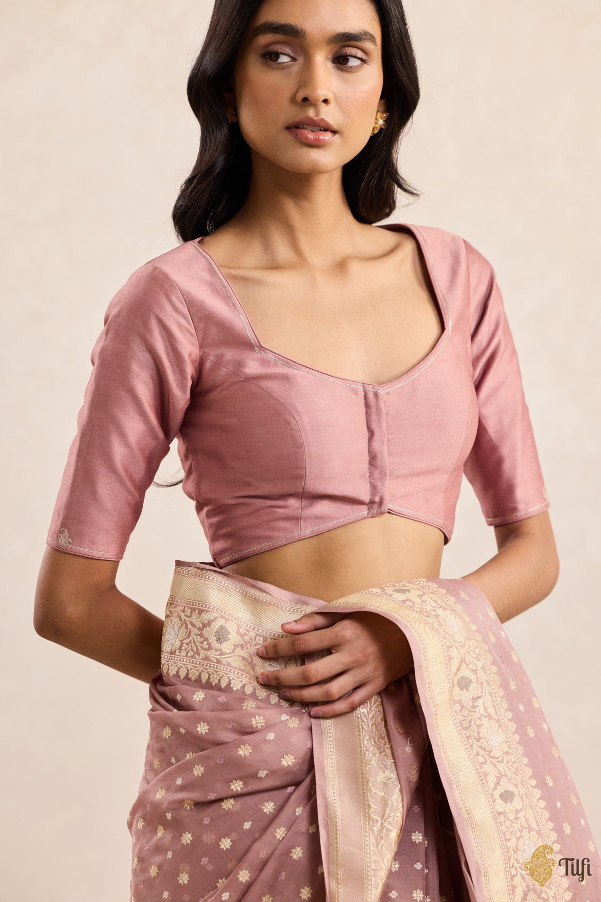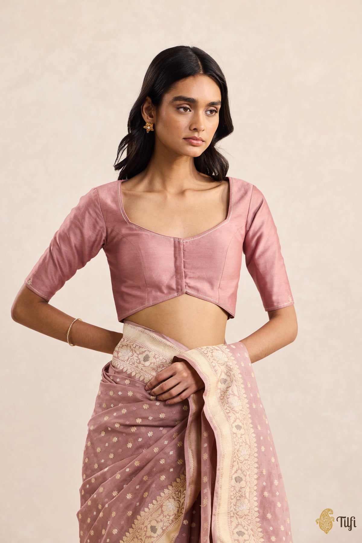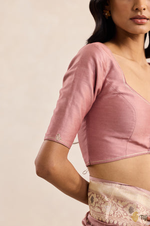 A graceful silk-cotton blouse designed to pair effortlessly with Tilfi’s handwoven sarees. Featuring a softly rounded square neckline, a front closure, and a high closed back, it is detailed with delicate hand-embroidered zari accents, including small, stylized Tilfi paisleys on the sleeve ends.