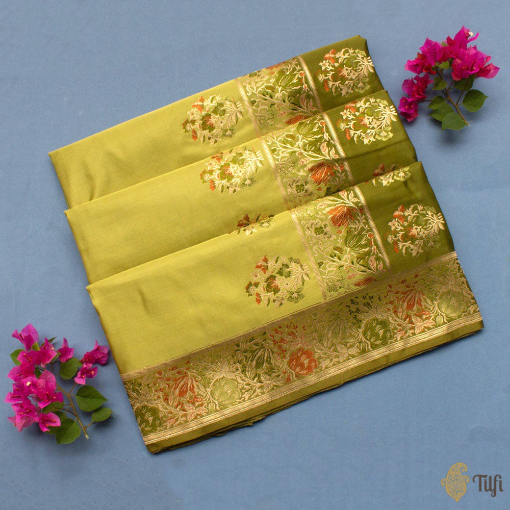 Yards of endearing Banarasi weaves to wrap you in old-world nostalgia! In a myriad of unforgettable shades and adorned with florals in intricate resham Meenakari, this is a beautiful Banarasi classic.