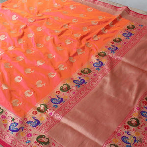 Technique - A classic handwoven Paithani; a technique that uses a zari warp to form a rich golden ground, adorned by beautiful Meenakari work, the painstaking addition of supplementary coloured threads during the hand-weaving process.