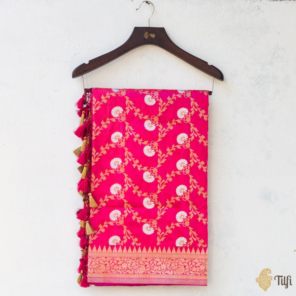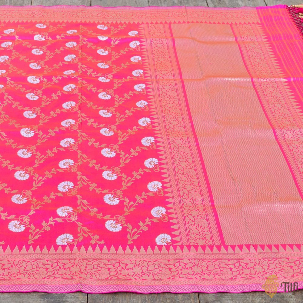 Nothing speaks to the splendour and opulence of Banarasi handloom better than this luxurious Odhni! A ravishing kadhua jaal, exquisitely crafted in gold and silver zari on a breathtaking silken bed.