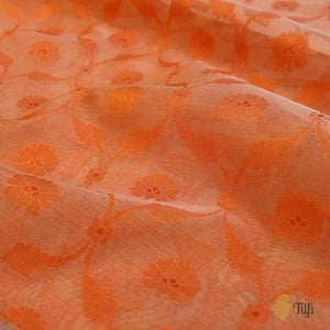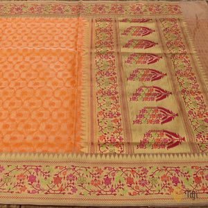 A beautiful handwoven reminder of our rich and vibrant heritage! Adorned with traditional jaal pattern woven in the finest banarasi style, this is a Banarasi classic in gossamer kora silk. Be swept away by the delightful meenakari border!