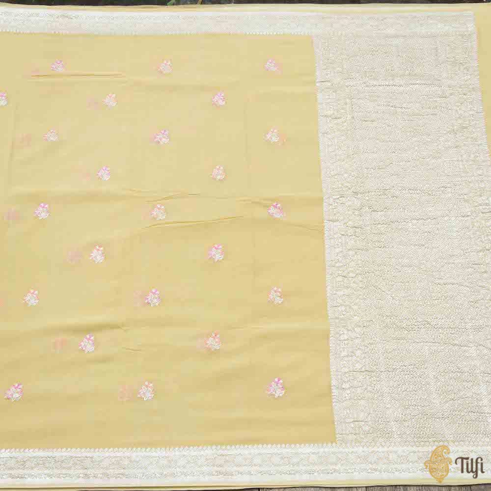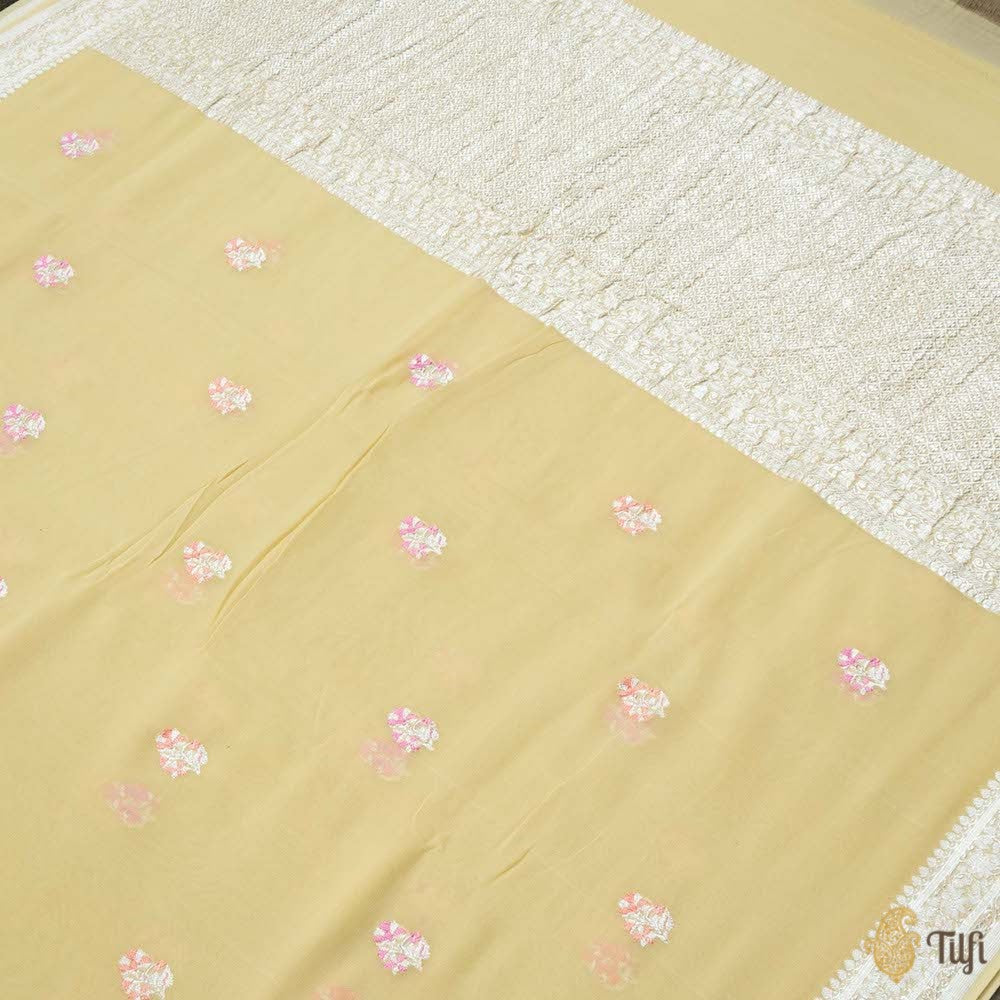 The daintiest shades and the prettiest bootidar pattern in town, make this delicate saree a wholly irresistible drape! Beautifully handwoven in silver zari with hints of meenakari, it's ready to steal your hearts.