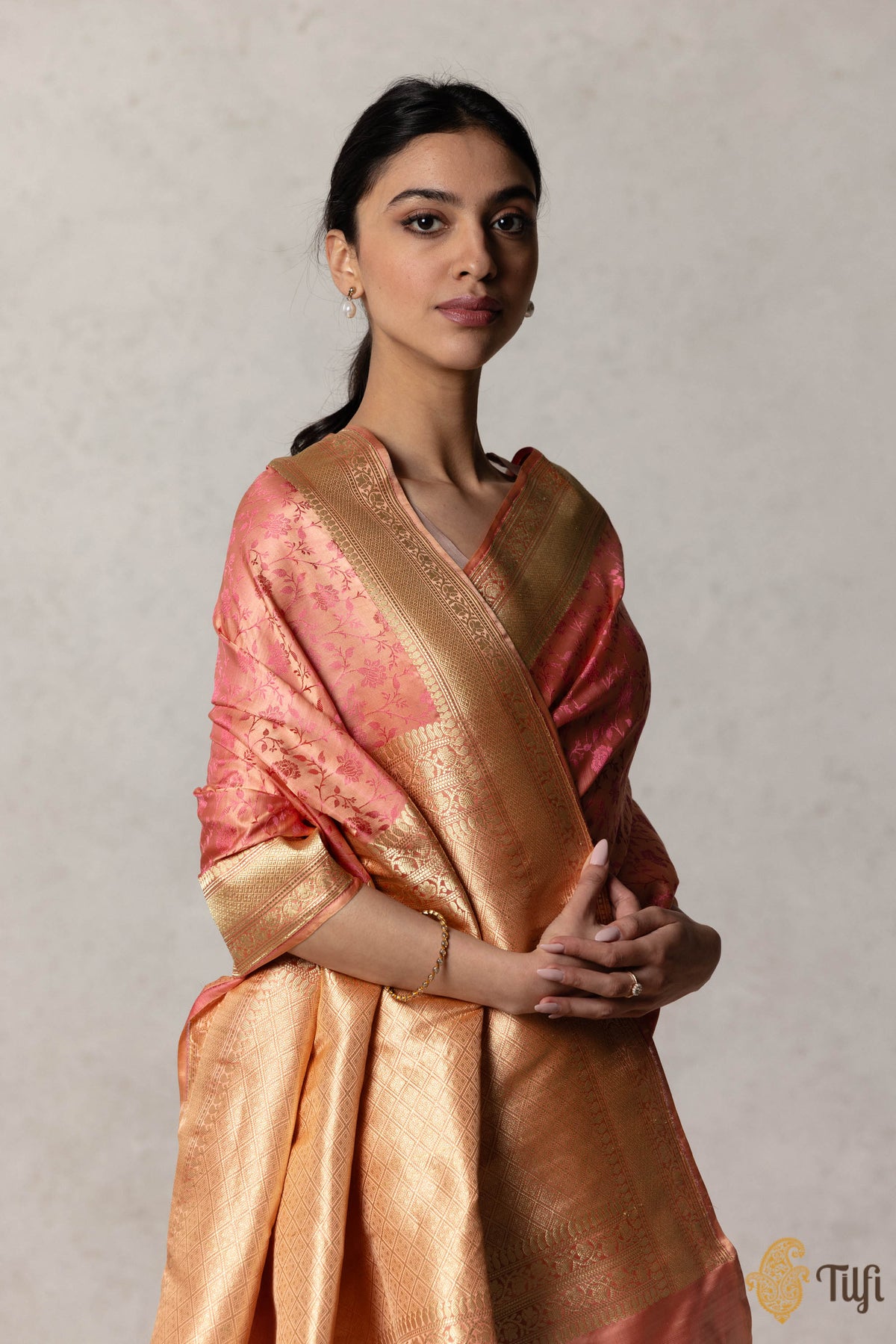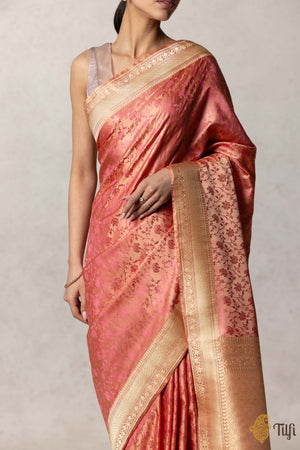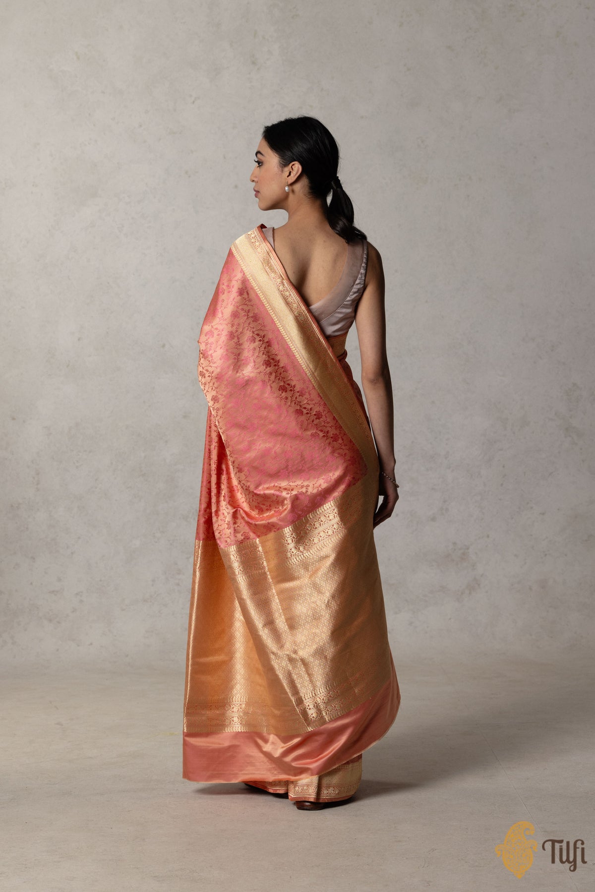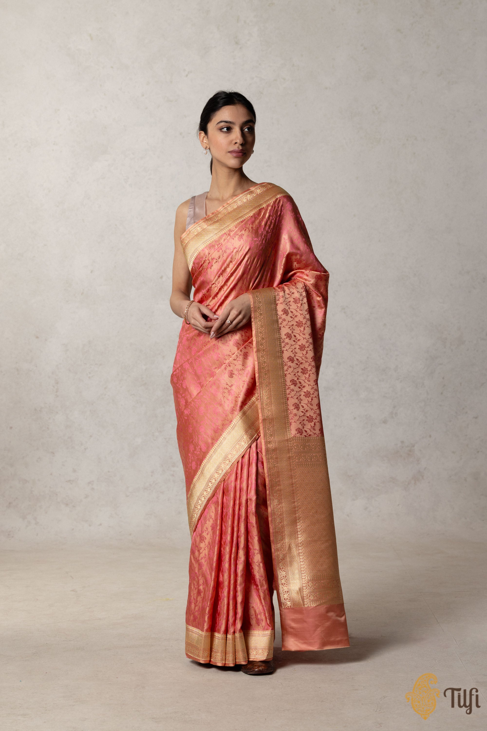 A peach-pink pure satin silk Banarasi saree with a subtle scrolling pattern of intricate florals handwoven using fine resham yarns. Finished with a classical zari border and pallu detailed with small paisley bells along the edges.