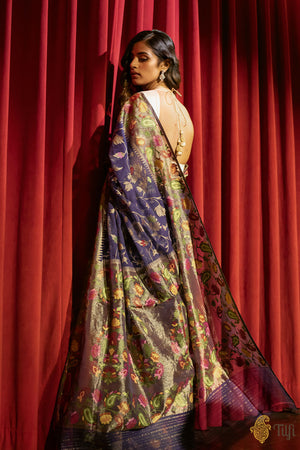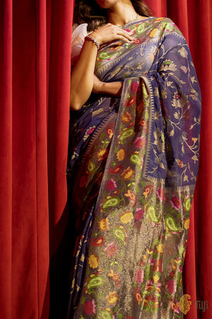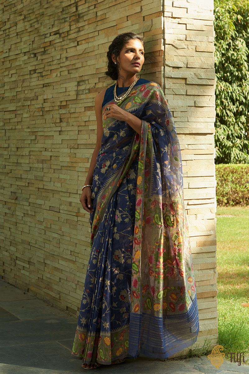 A singular composition with the beauty of fine cotton set against the lustre of pure tissue! A tenderly woven drape in the sublime Jamdani weave, featuring joyful meenakari lotuses. An unadulterated Banarasi masterpiece in pure Silver zari, destined to become a family heirloom.
