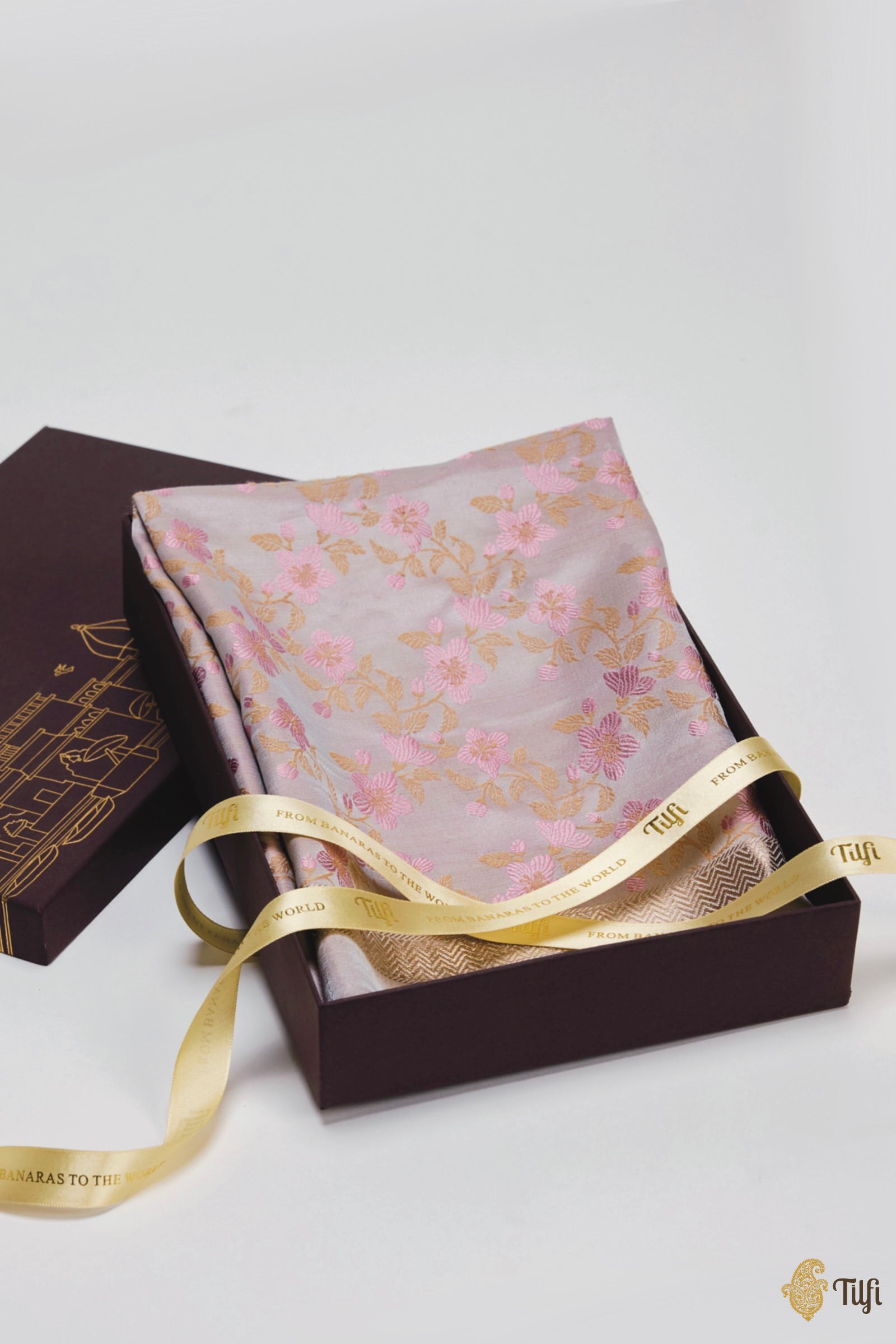 A delicate drape in satin silk, handwoven with floral meenakari inspired by Almond Blossoms. Finished with a narrow zari border, it is a quiet expression of grace and craftsmanship.
