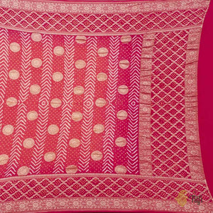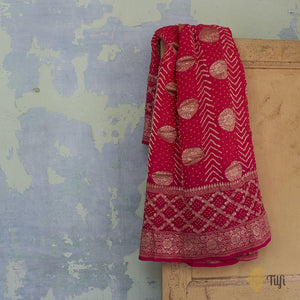A celebration of Indian textile arts! This handwoven Banarasi dupatta has been hand-dyed in the classic Kutchi Bandhani technique. Splendid zari bootas with tie-dye accents and beautiful, vibrant colours to bring on the festive spirit!
