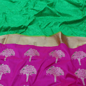 A vibrant and celebratory ensemble in the finest Banarasi style! A luxurious kadhua weave dupatta with a clutter-breaking tree motif, paired with a gorgeous Tanchoi weave fabric, all together to make you stand out from the crowd.