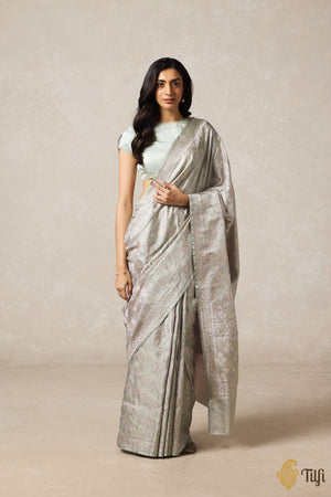 Technique - The finest Tanchoi weaving technique, which employs one or more warps and multiple coloured wefts to produce a self-design which covers the body of the saree. Meenakari involves the painstaking addition of supplementary coloured resham threads during the hand-weaving process.