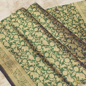 A rich and luxurious Shikaargah handloom saree. Zari vines, animal motifs and intricate jungle scenes make this a piece of woven art. An ode to handloom and a true Banarasi masterpiece.