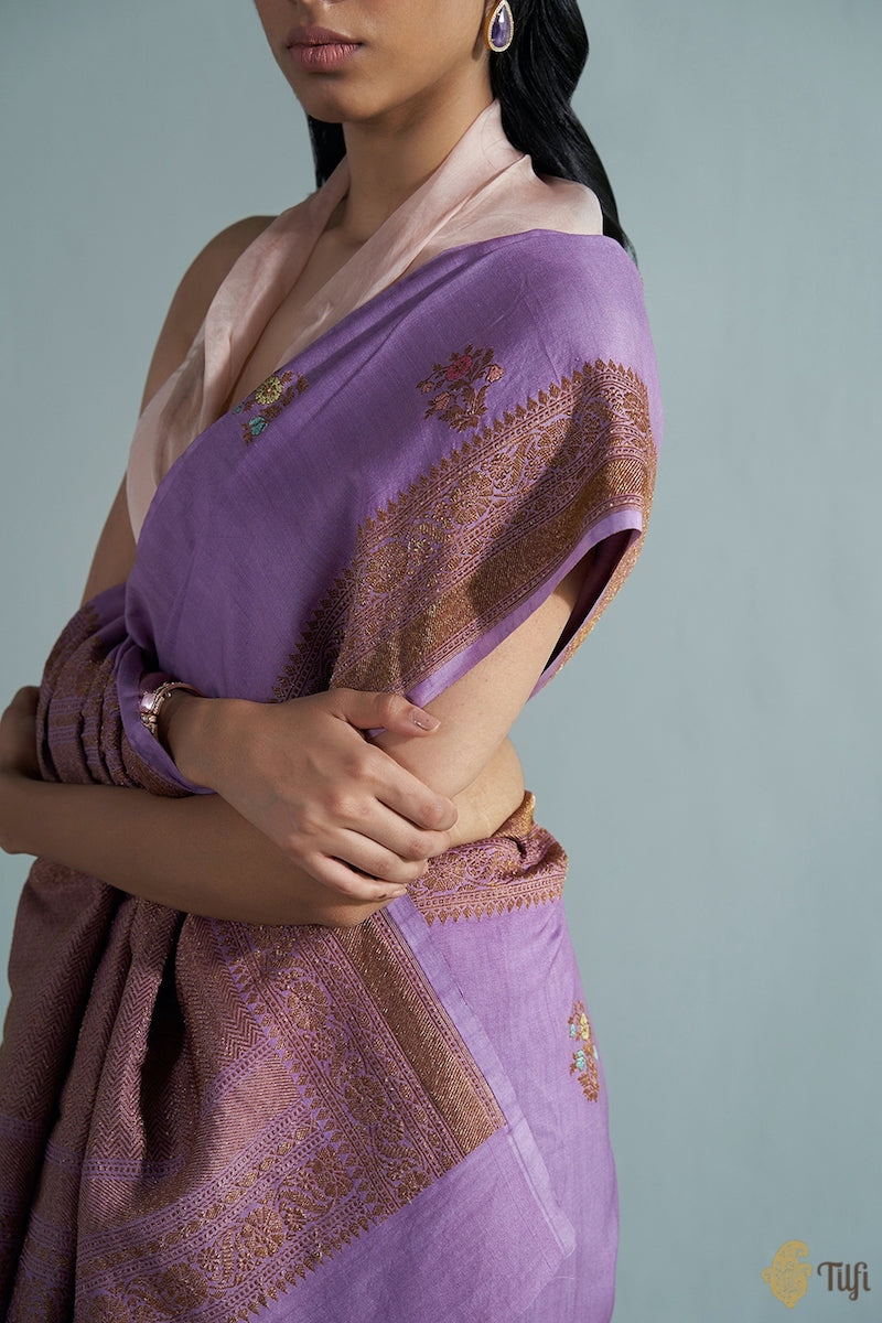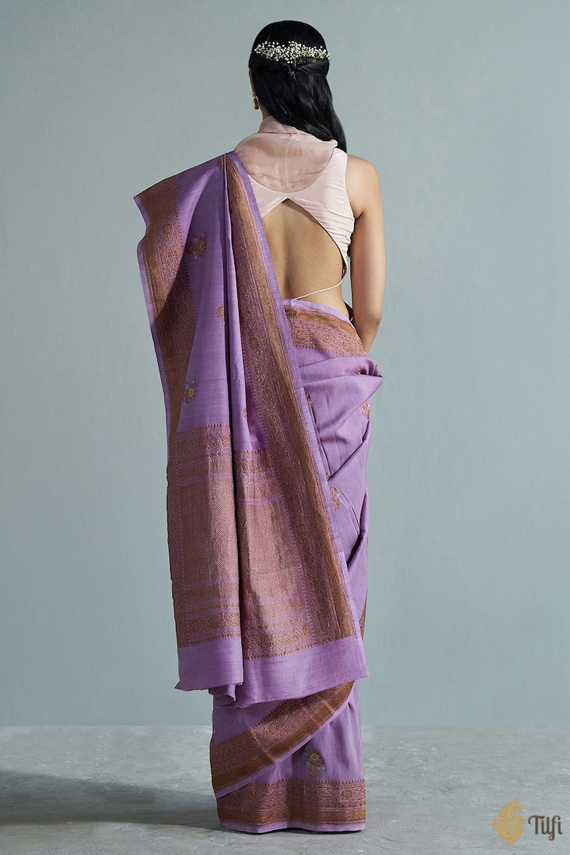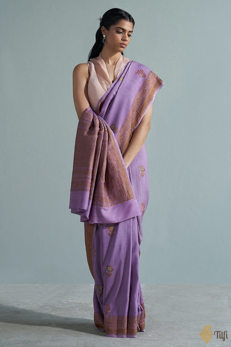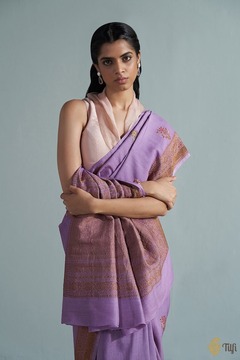 A saree steeped in nostalgia, enchanting colours and adorned with delicate floral motifs and meenakari accents. Exquisite, individually woven, antique zari kadhua bootas on a beautiful textured bed of silk - this saree is a charming piece of handloom heritage, with love from Banaras.