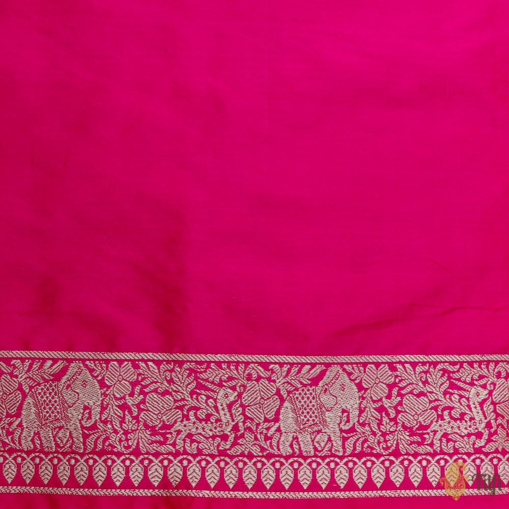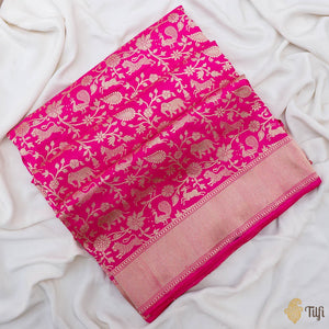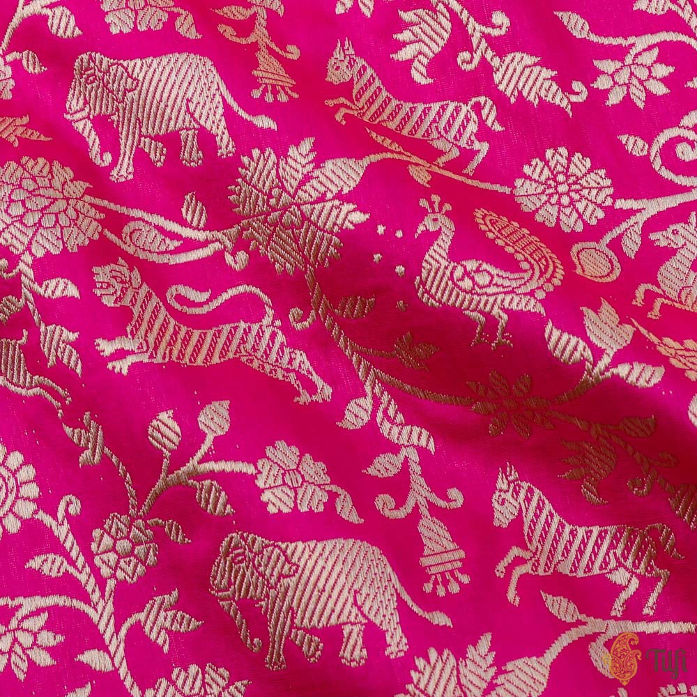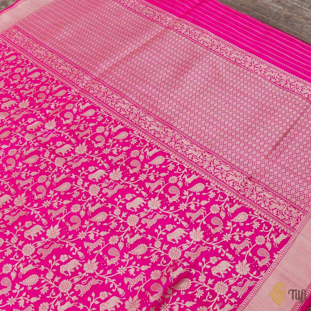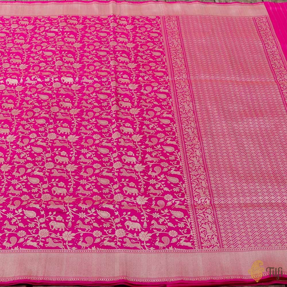 A rich and luxurious Shikaargah handloom saree. Zari vines, animal motifs and intricate jungle scenes make this a piece of woven art. An ode to handloom and a true Banarasi masterpiece.