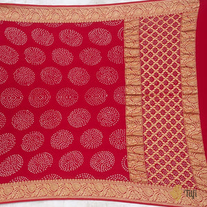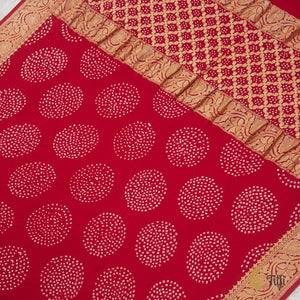 A celebration of Indian textile arts! This handwoven Banarasi dupatta has been hand-dyed in the classic Kutchi Bandhani technique. A gorgeous zari border and aanchal with tie-dye accents on the entire body and beautiful, vibrant colours to bring on the festive spirit!