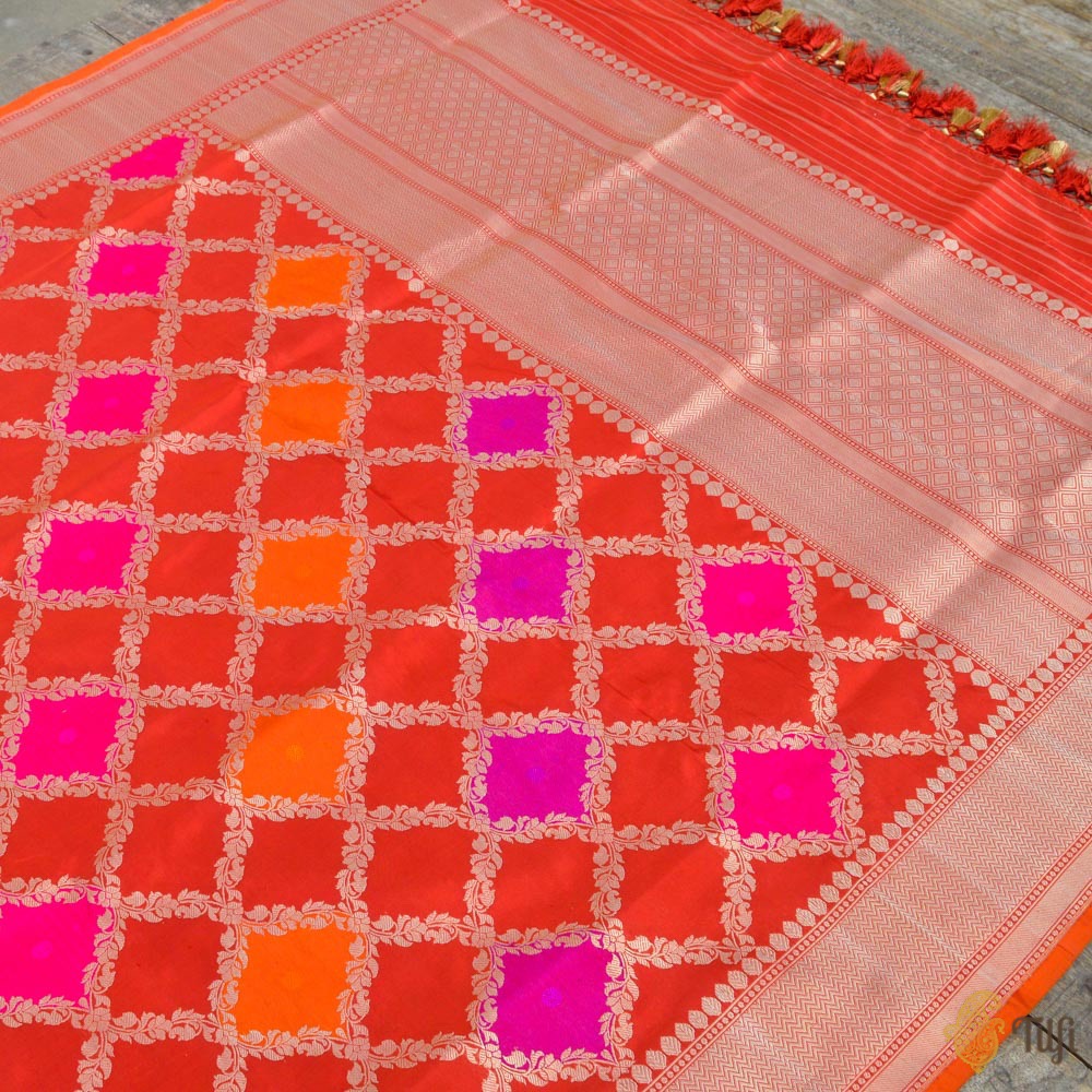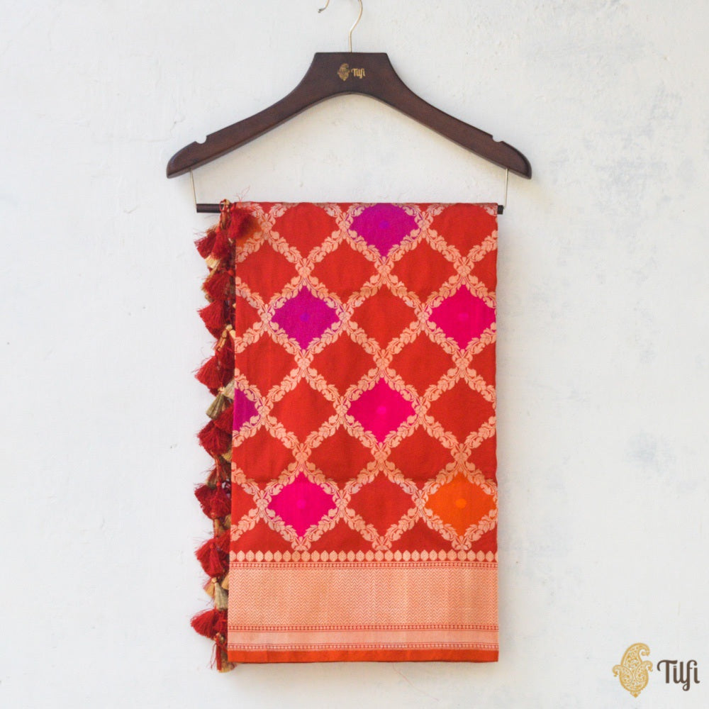 A luxurious, opulent odhani to add cheer and a touch of luxury to any special occasion! A traditional kadhua lattice pattern, elevated by glorious blocks of meenakari in festive hues.