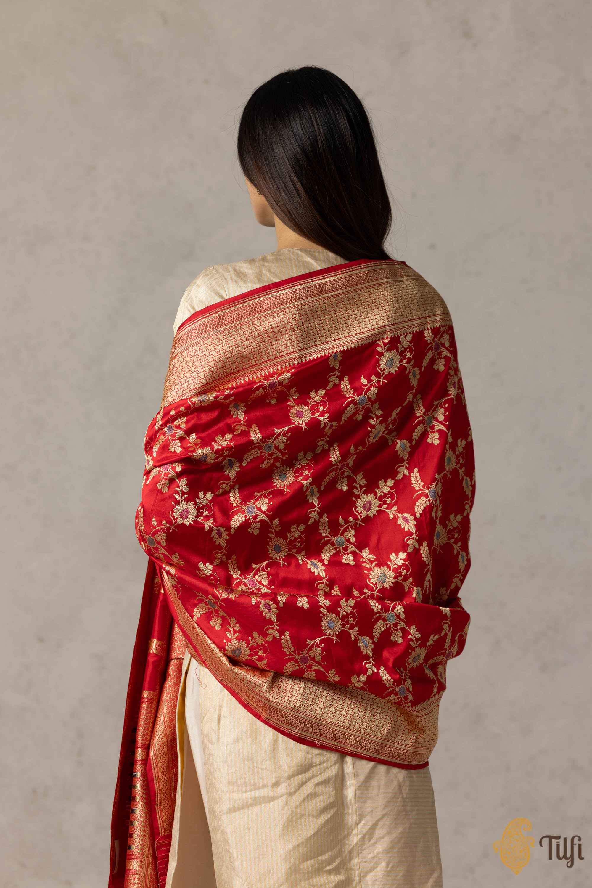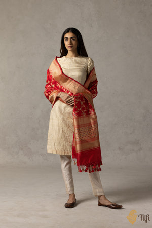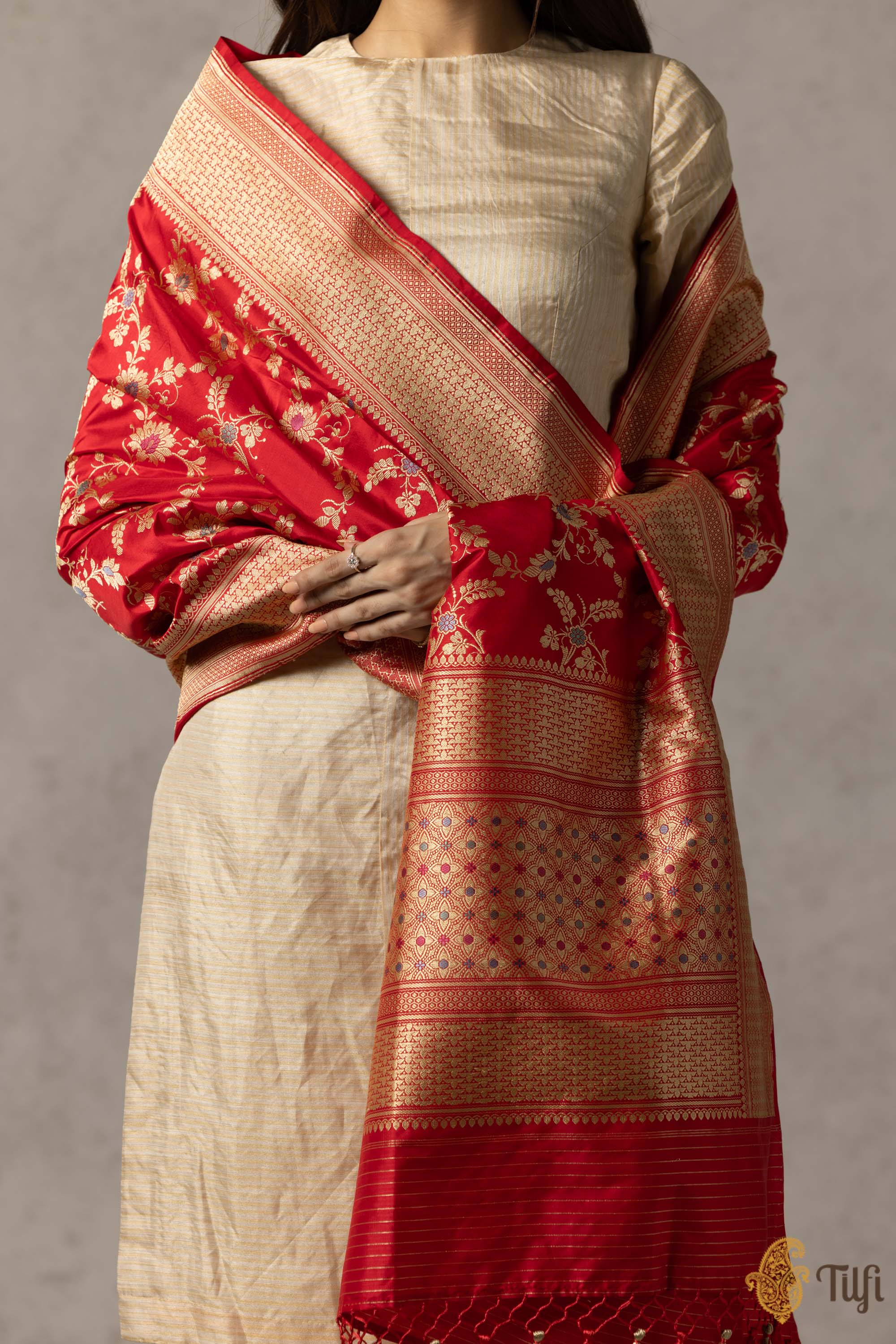 An ornate Banarasi dupatta with a floral trellis pattern, Meenakari accents, and fine zari gold work. Incredible detailing on a soft and lustrous bed of pure Katan silk. Finished with a playful series of tassels.