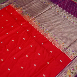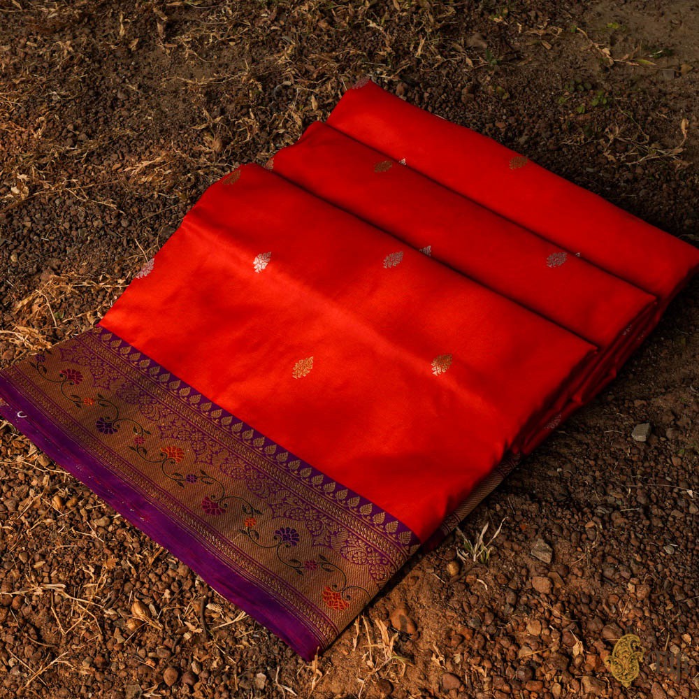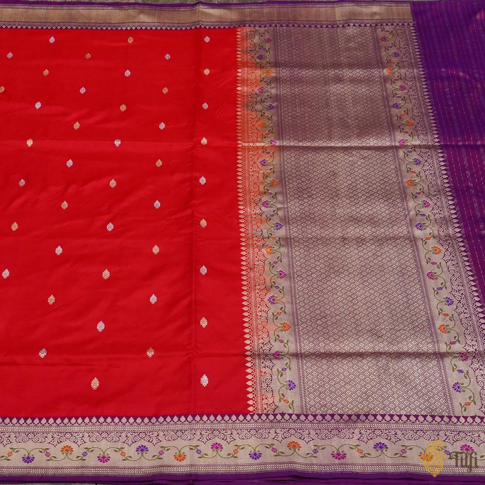 Technique - Classic handwoven Banarasi Meenakari art passed down through generations. Meenakari involves the painstaking addition of supplementary coloured resham threads during the hand-weaving process. An enduring Kadwa weave. The elaborate and laborious Kadwa (Kadhua) technique involves hand-weaving each motif separately. It takes longer on the handloom, but makes a more robust pattern, which stands out on the fabric.