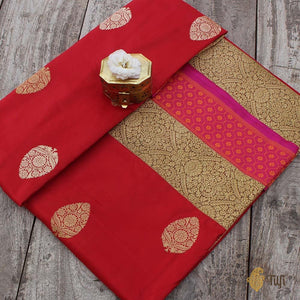 Speciality - A memorable pattern handwoven in the finest kadwa weave, a beautiful border and an elaborate blouse to go. This saree is a unique gift from Banaras.