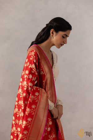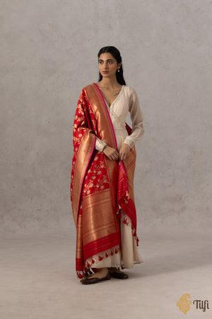 A vibrant Banarasi handloom dupatta with an all-over Kadwa floral jaal in glistening gold and silver zari. Masterfully handcrafted on a bed of soft Katan silk.