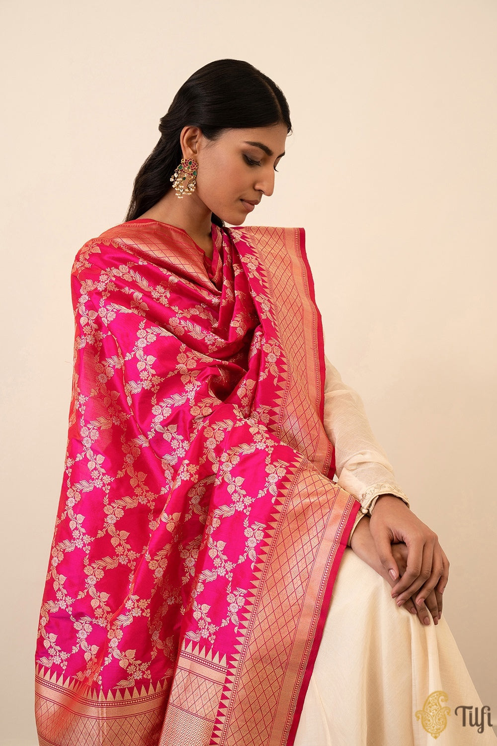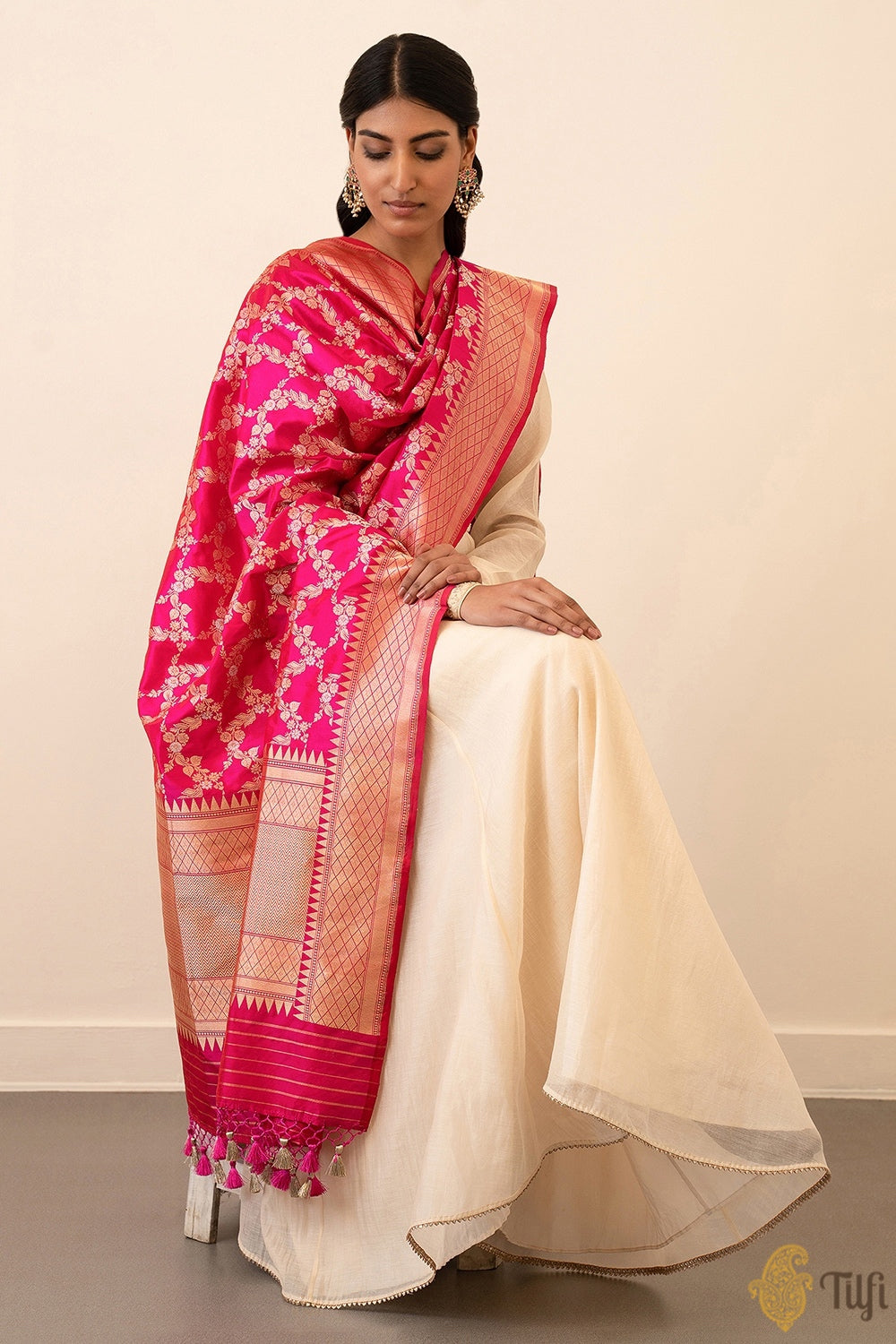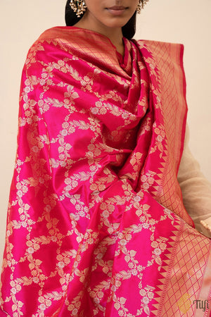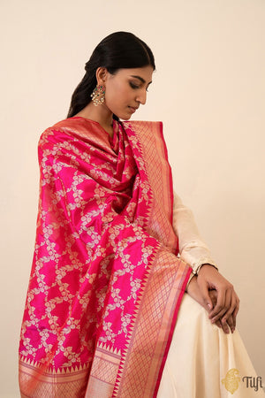 The splendour of silk and the finest craftsmanship make this dupatta a timeless piece of handloom art! This exquisite, dense, full Kadwa floral jaal in gold and silver zari is the definition of quintessential Banarasi opulence.