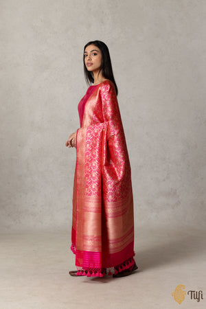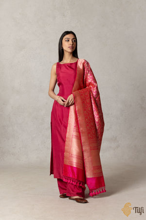 A red-rani pink Banarasi dupatta with mesmerising Shikargaah art in gold zari. A beautiful handloom masterwork to capture joyfulness on silk with regal bird motifs and stately elephants amidst a landscape of vines.