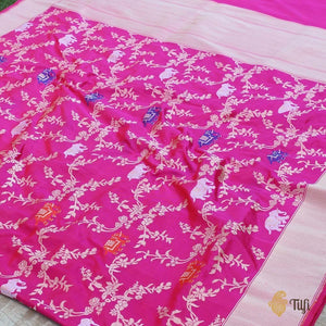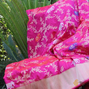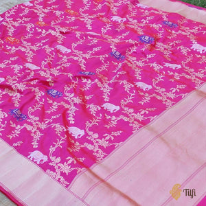 A marvellous Banarasi with a scrolling cutwork jaal, interspersed with stately elephant motifs in the finest kadhua and meenakari weaves! Ever so regal in its appeal, this is Banarasi handloom art at its finest.
