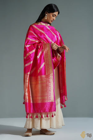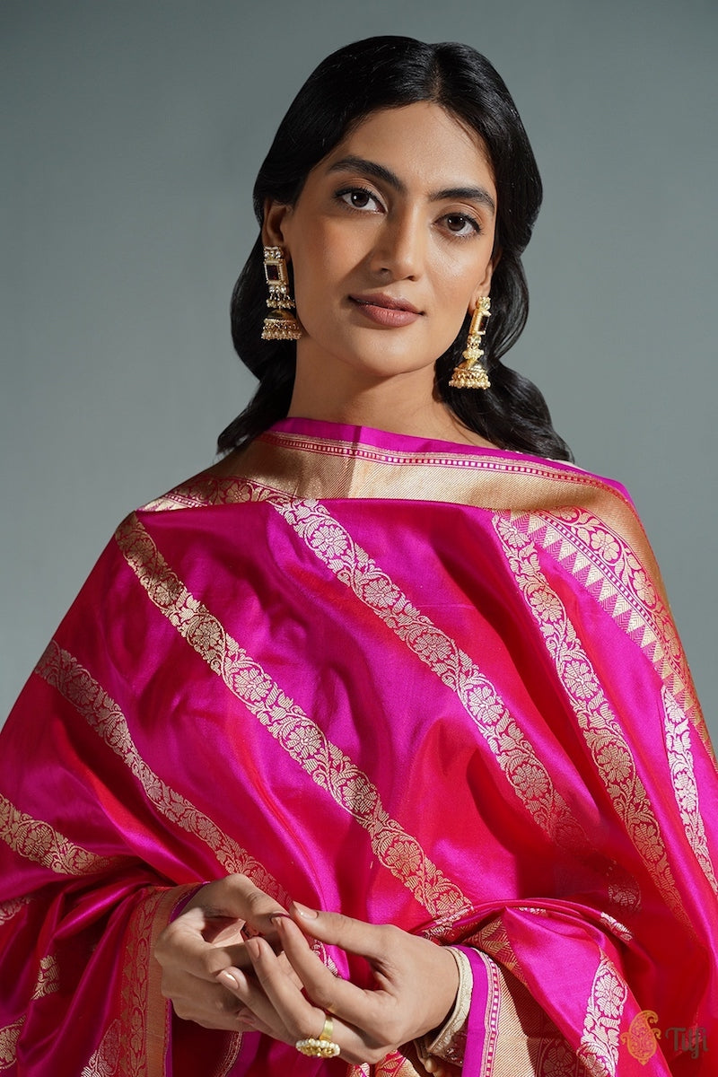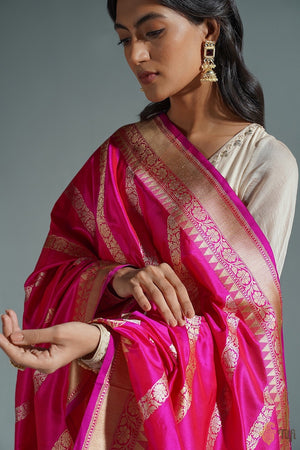 Stand out from the crowd in this exceptional aadha (diagonal) jaal dupatta. A classic handloom masterpiece, with beautiful floral bels in gold and silver zari, woven in the exquisite kadhua stye. Unconventional and irreplaceable.