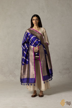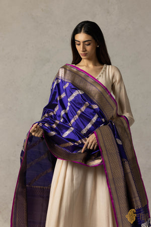 A delicately handcrafted dupatta with an intricate aadha (diagonal) jaal, crafted in the finest weave in regal gold and silver zari, and edged with a contrasting pink selvedge. An unforgettable Banarasi classic.