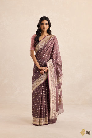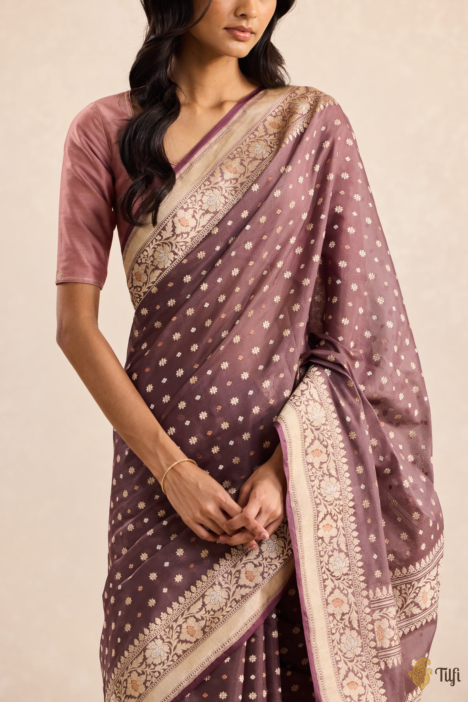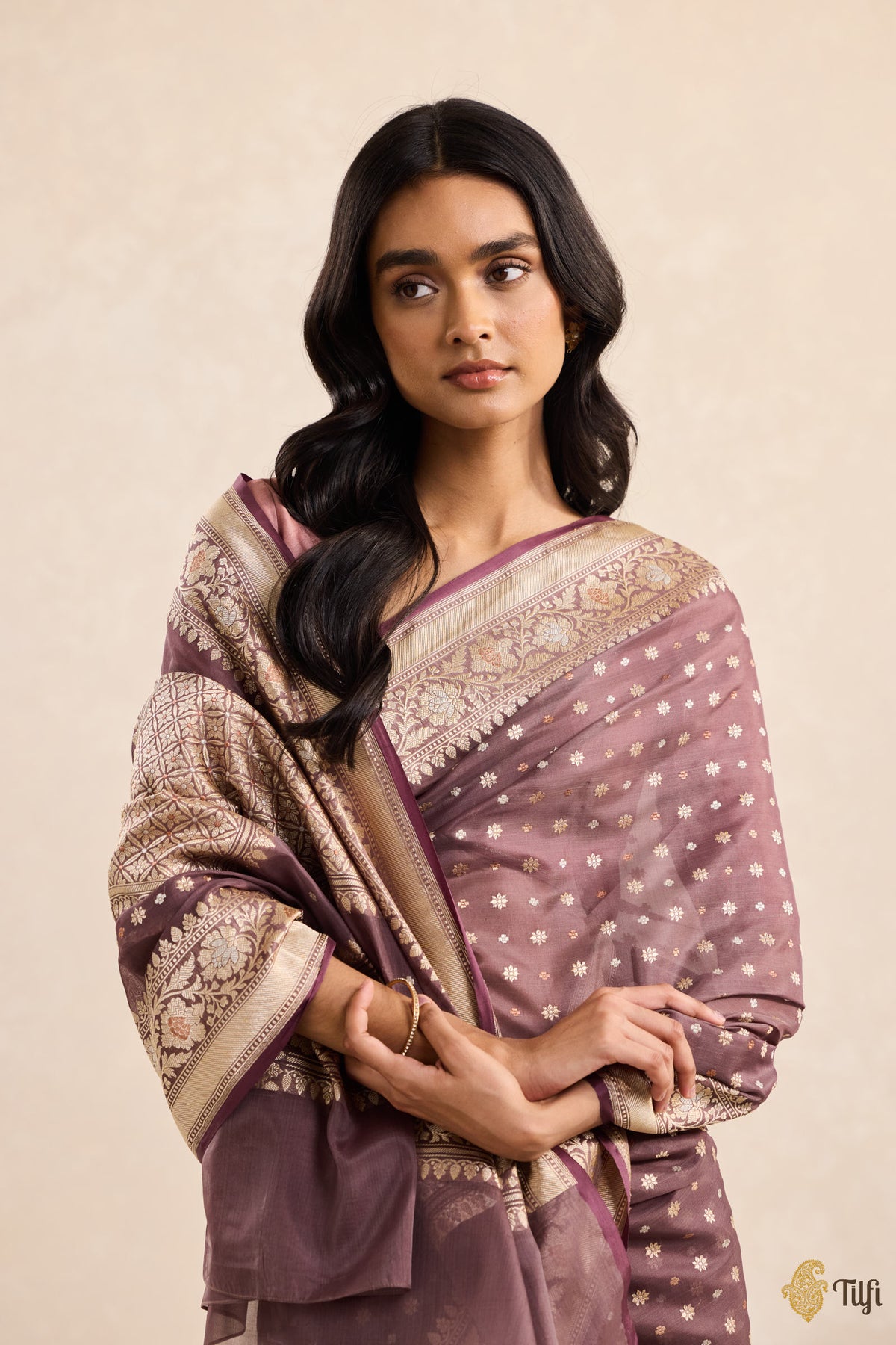 Flecks of gold, silver, and resham scatter across an ethereal ground, like fragments of light drifting through an old courtyard. Scattered Light celebrates delicate abundance — an heirloom kadhua bootidaar saree edged with a floral border, gently touched by meenakari accents. A tender weave of time, craft, and brilliance.