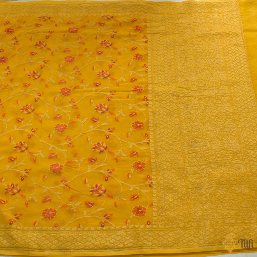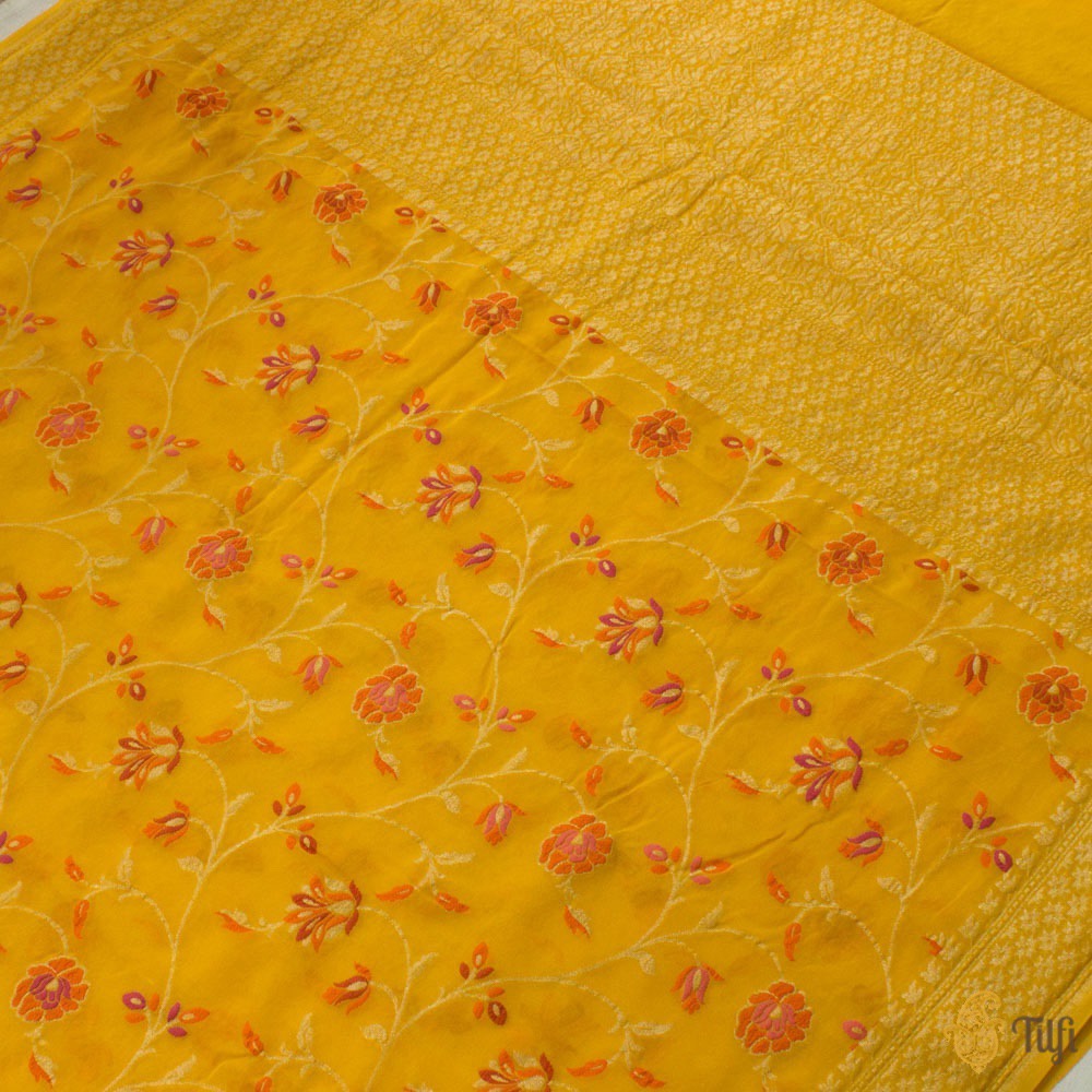 Technique - Classic handwoven Banarasi Meenakari art passed down through generations. Meenakari involves the painstaking addition of supplementary coloured resham threads during the hand-weaving process.