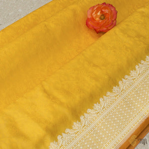 Technique - The finest Tanchoi weaving technique, which employs one or more warps and multiple coloured wefts to produce a self-design which covers the body of the saree. Border and pallu in the enduring Kadwa weave. The elaborate and laborious Kadwa (Kadhua) technique involves hand-weaving each motif separately. It takes longer on the handloom, but makes a more robust pattern, which stands out on the fabric.