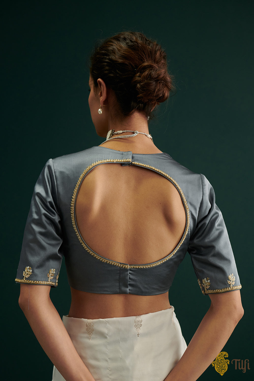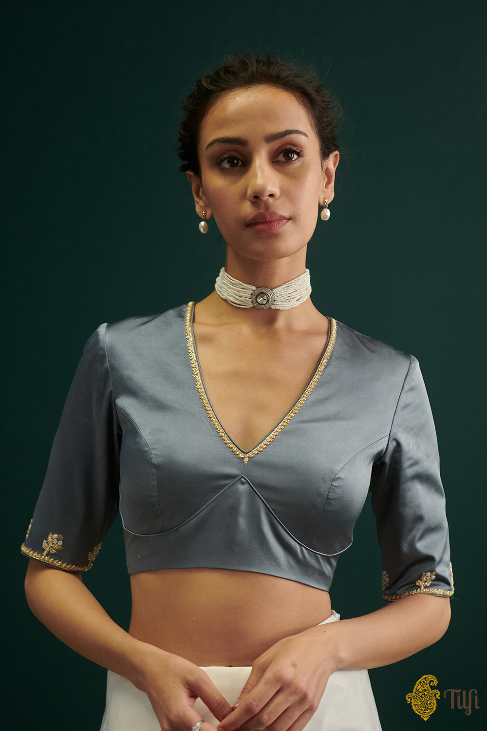 A classic grey satin silk blouse with carefully hand-embroidered pearl and cutdana work on the v-neck, sleeves, and circular back cutout. Adorned with alluring motifs of roses daintily positioned around the borders of the sleeves.