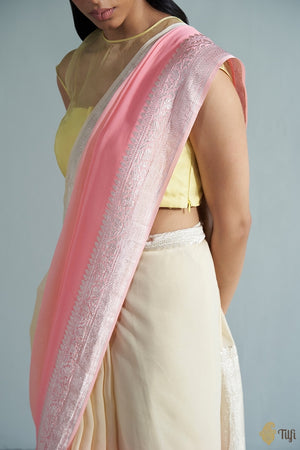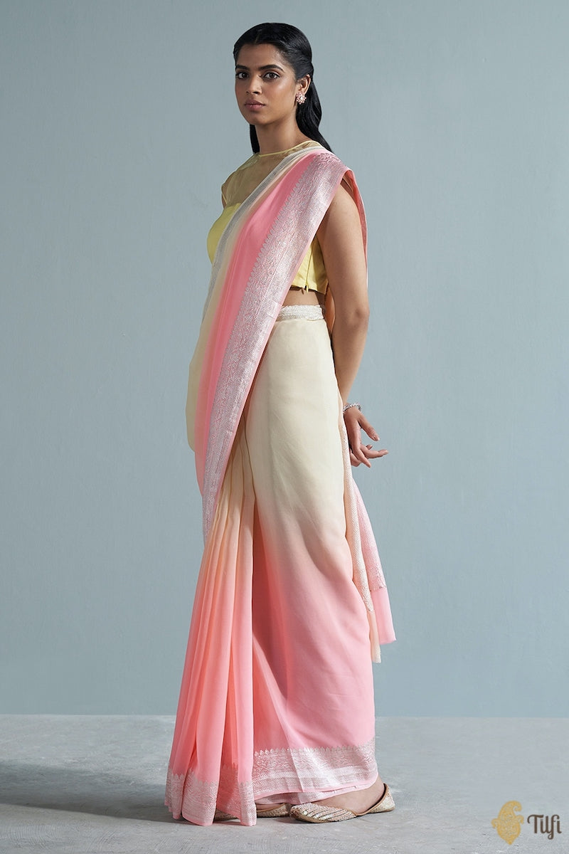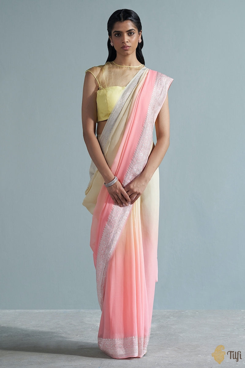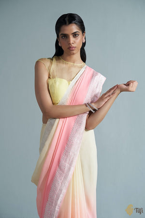 A chic and fabulous drape. A beautiful hand-dyed body in a dramatic Ombré and a delicate border in the exquisite kadhua weave. Traditional Banarasi art with a hint of the contemporary.