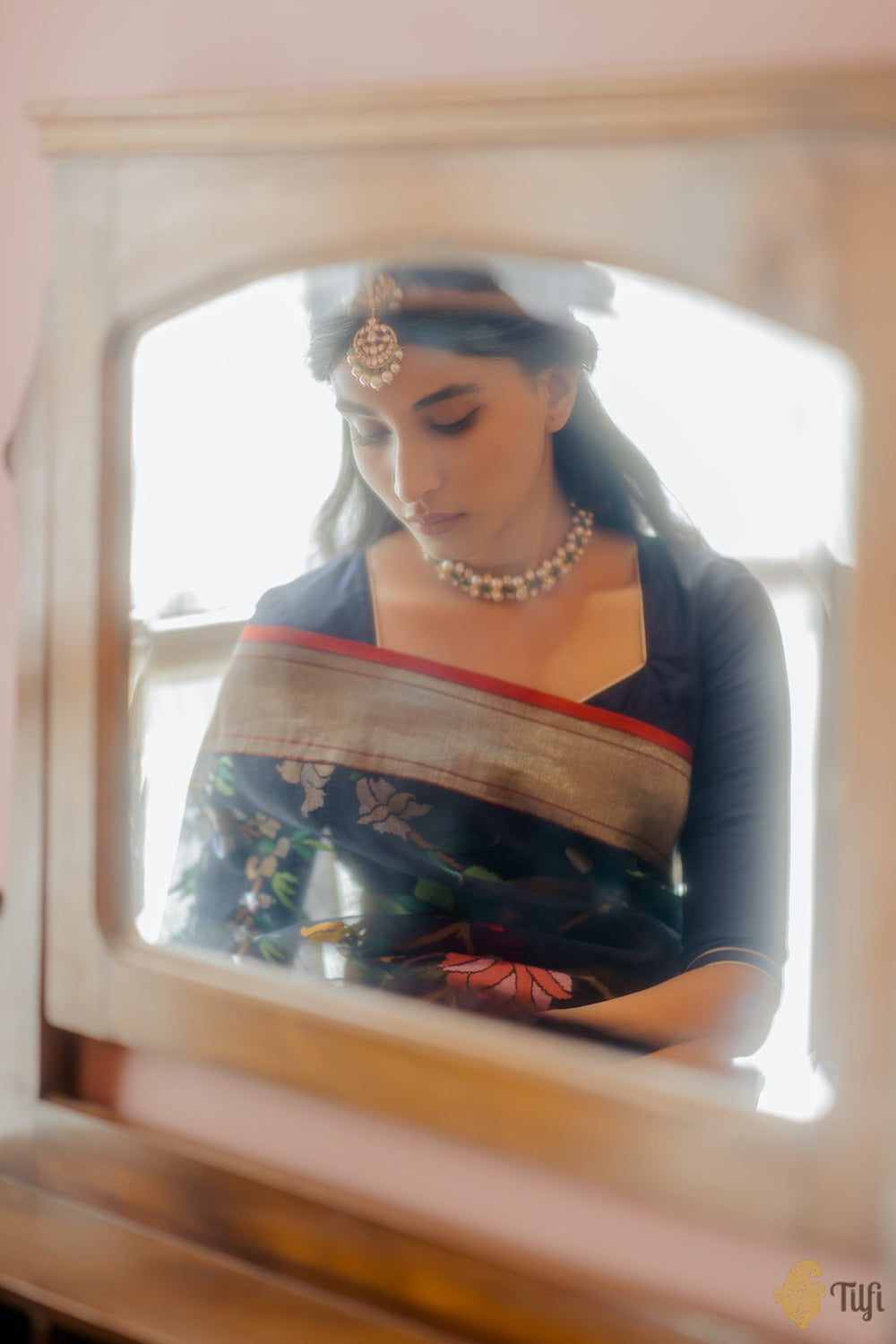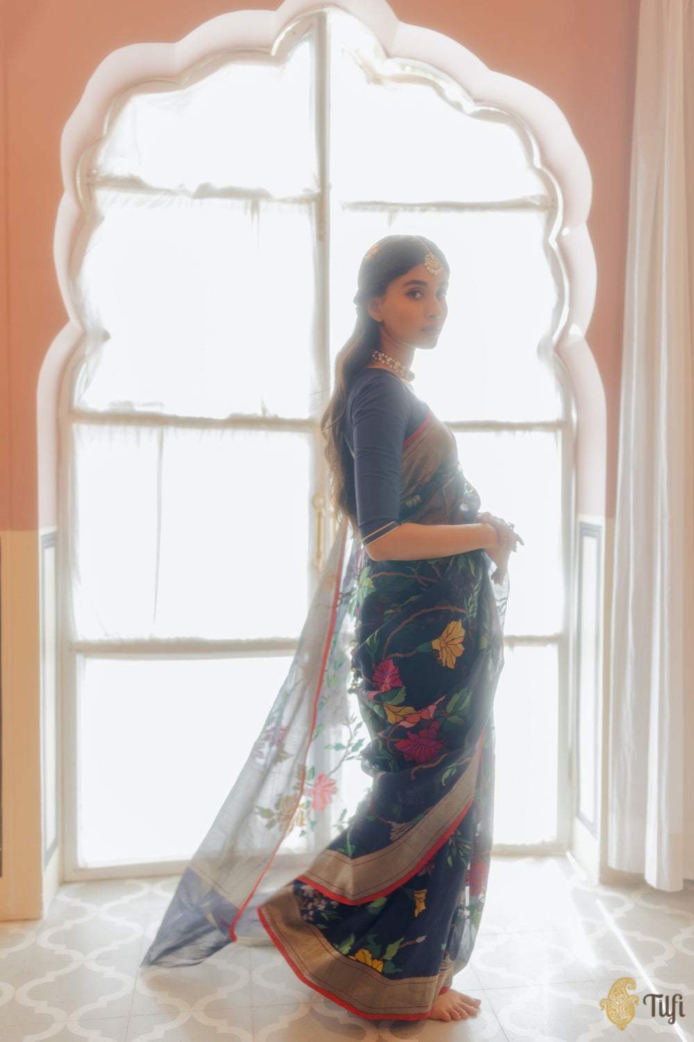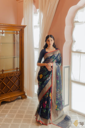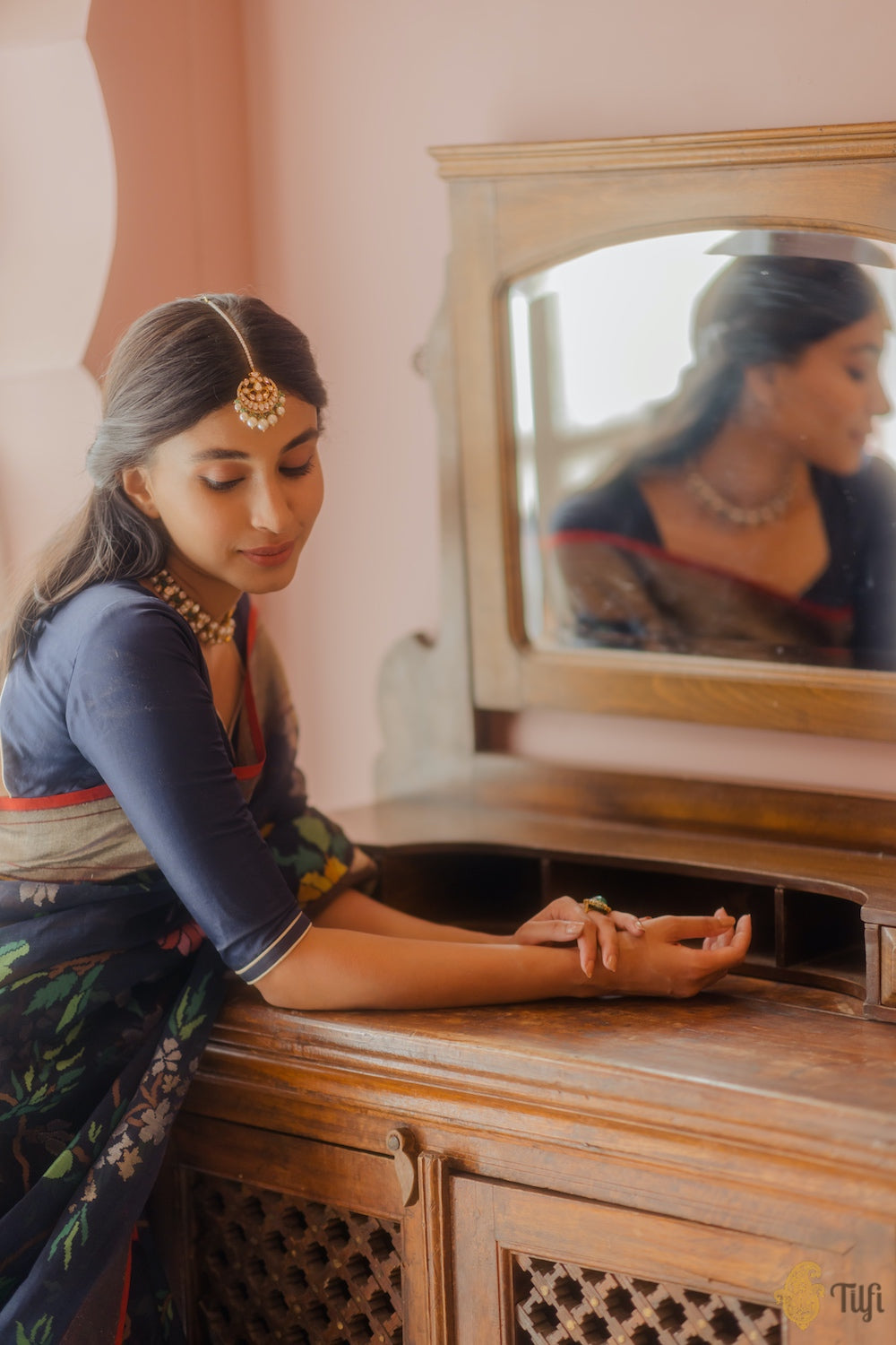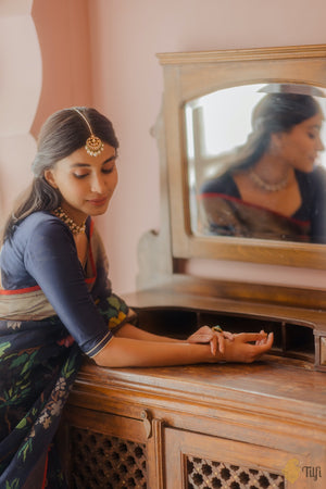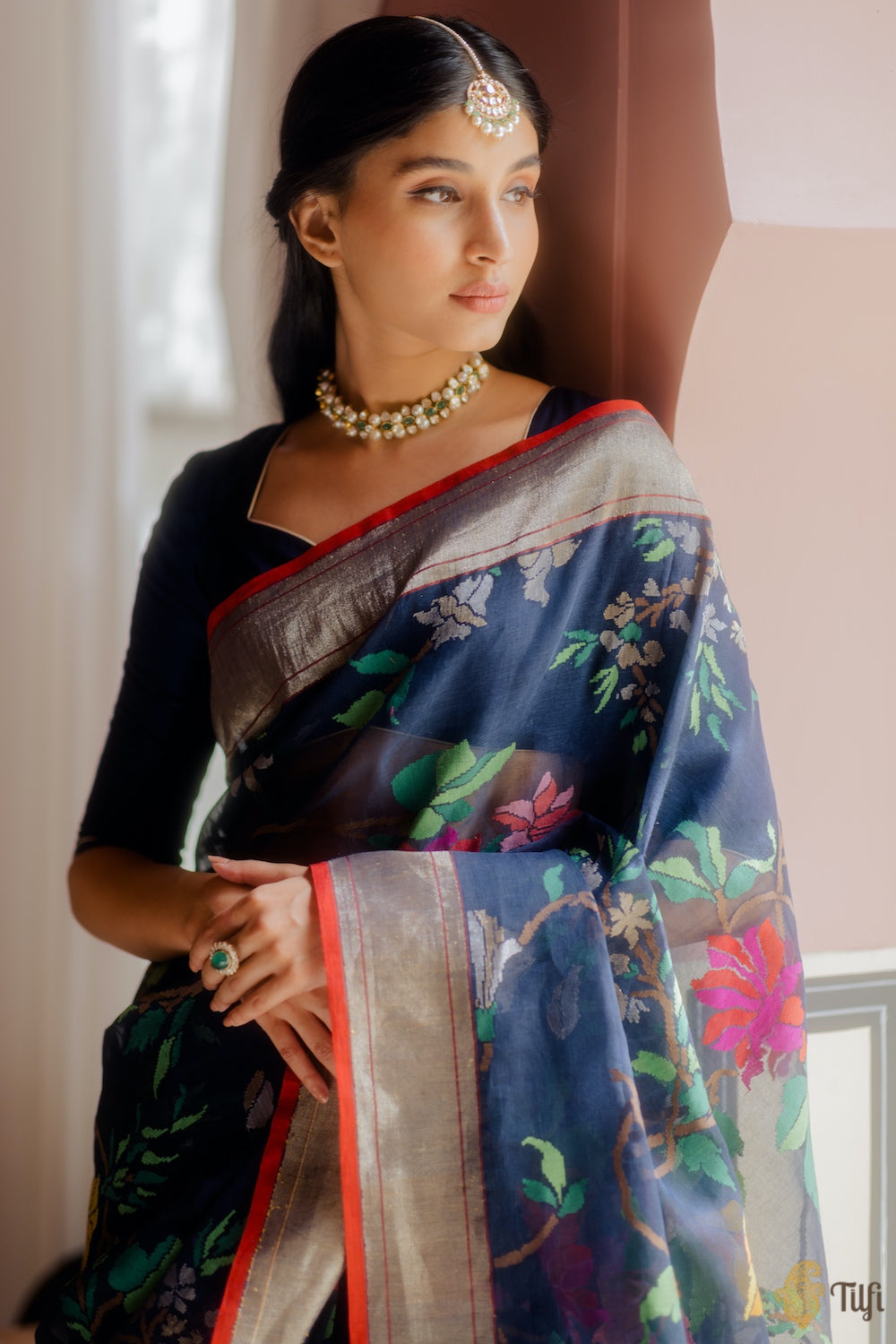 This stunning Jamdani classic, adorned with magical meenakari blooms is certain to enrapture. A breathtaking drape crafted in real silver zari on a bed of pure handspun, handwoven cotton. A timeless and unadulterated Banarasi masterpiece.