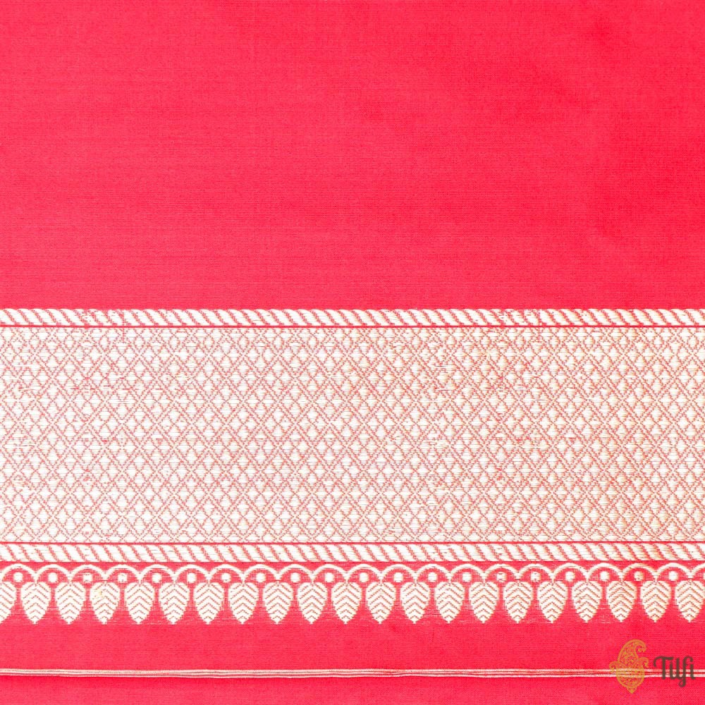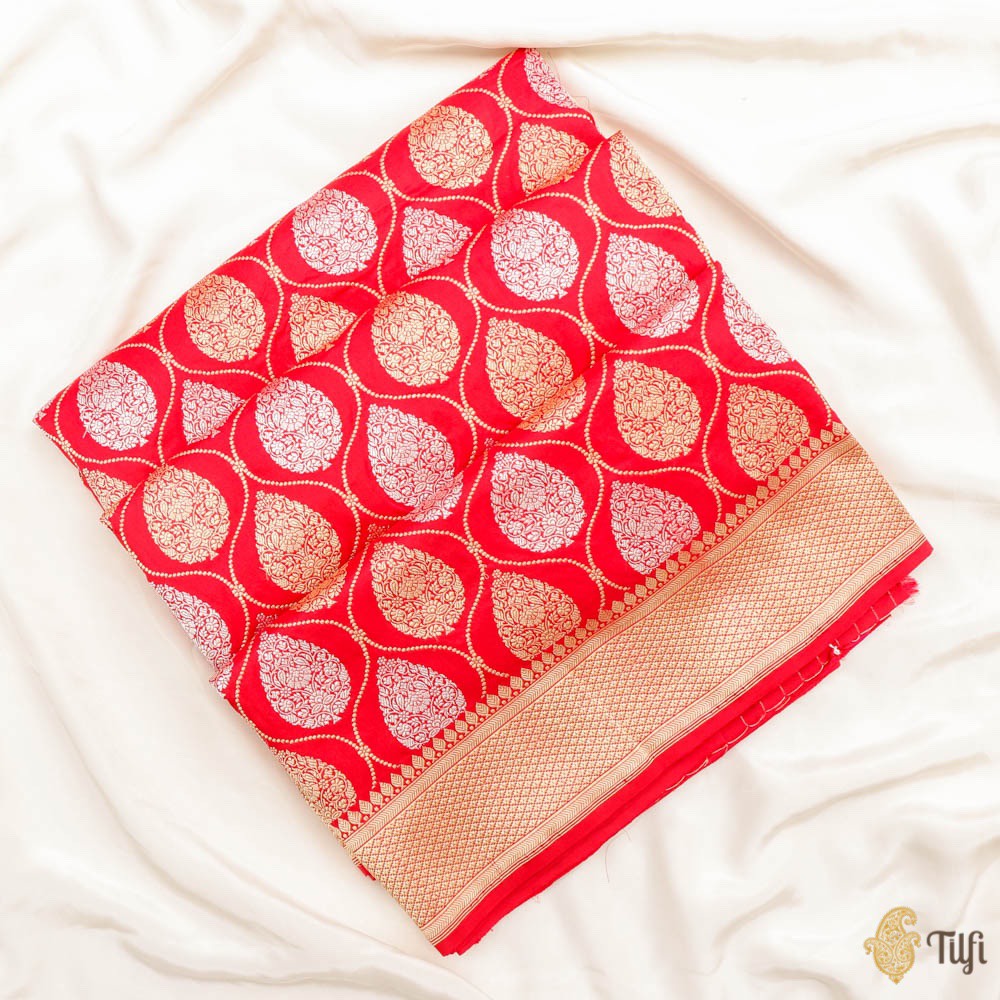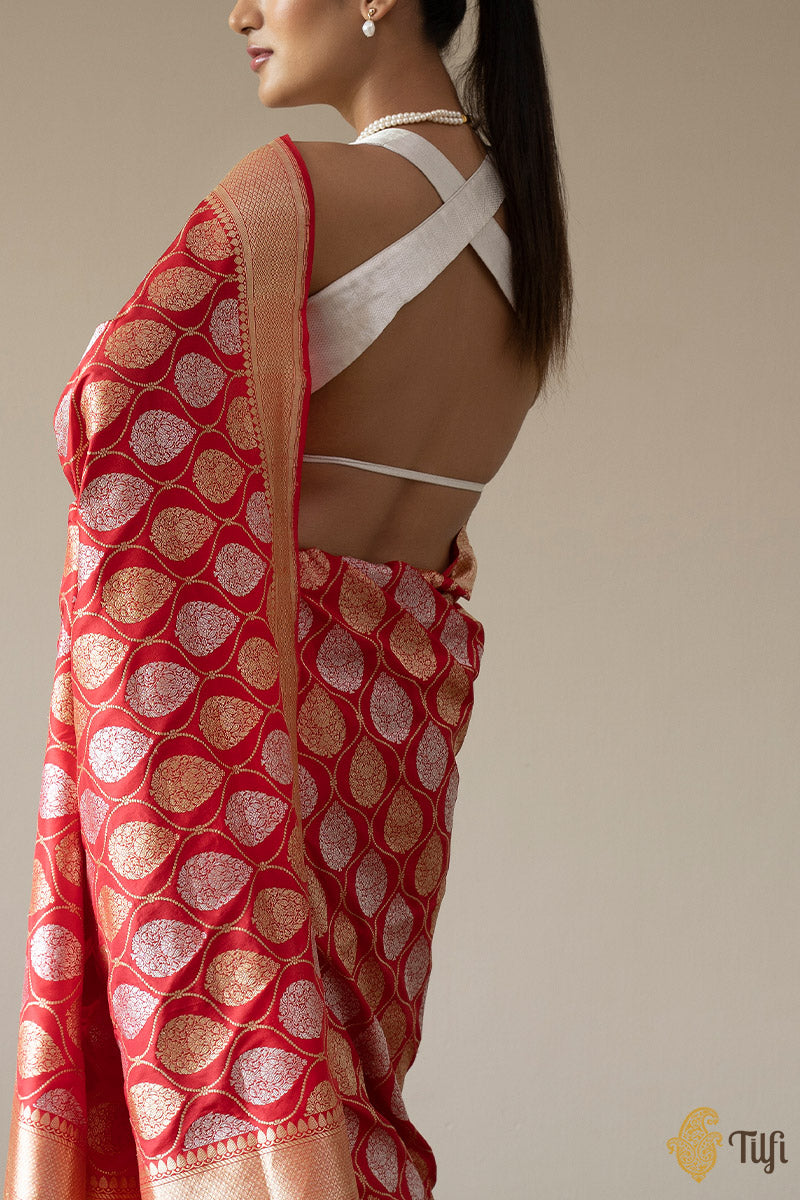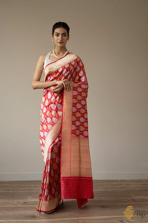A timeless handloom saree in a rich, regal colour and abundant use of gold and silver zari. It is adorned with exquisitely detailed bootas and a jaali pattern of classic Banarasi opulence.