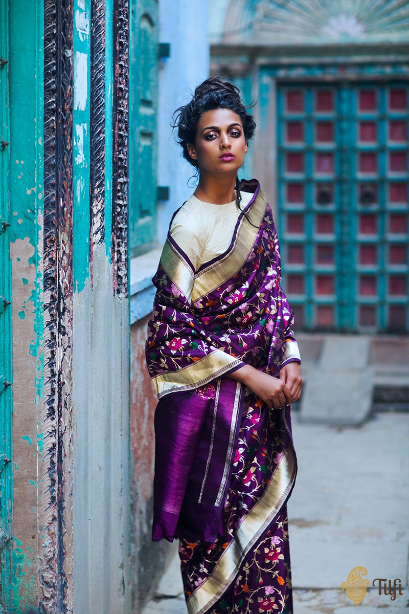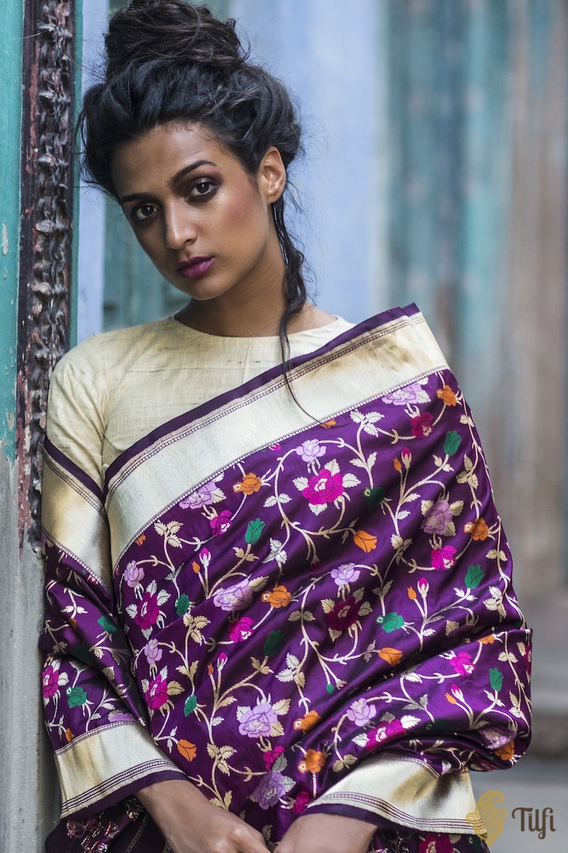 Technique - Classic handwoven Banarasi Meenakari art passed down through generations. Meenakari involves the painstaking addition of supplementary coloured resham threads during the hand-weaving process.