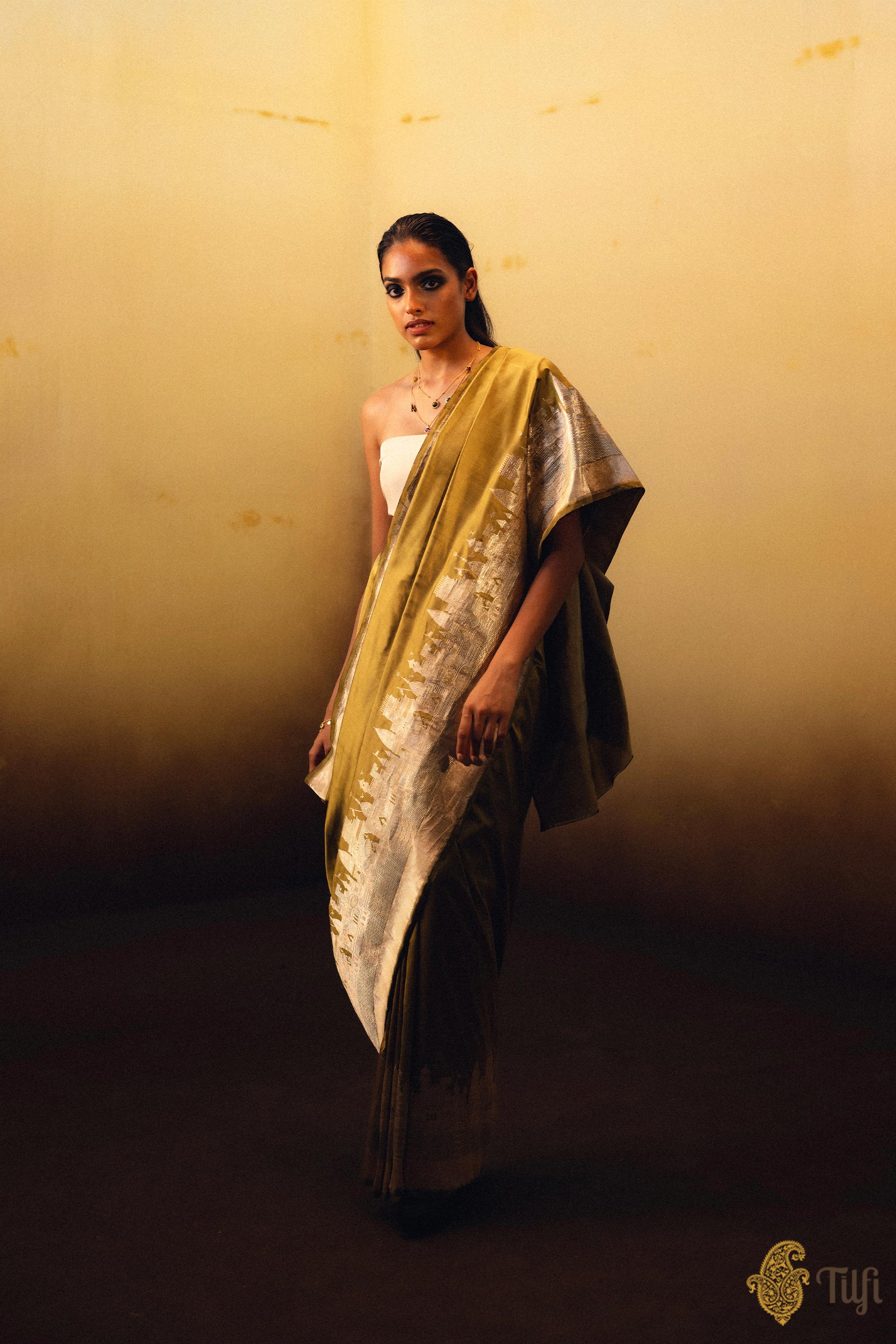 Speciality - The glorious outline of Varanasi's Ghats, lovingly handwoven on a base of resplendent silk in Roopa Sona or Gold and Silver zari. Incredible in its details and a mirror to the splendour of Banaras as seen from the river Ganga.