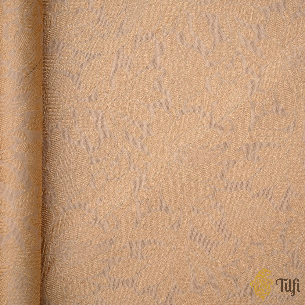 A floral dream! Breathtaking flowers and delicate vines bloom on a silken bed in light zari. A beautifully detailed floral jaal fabric.