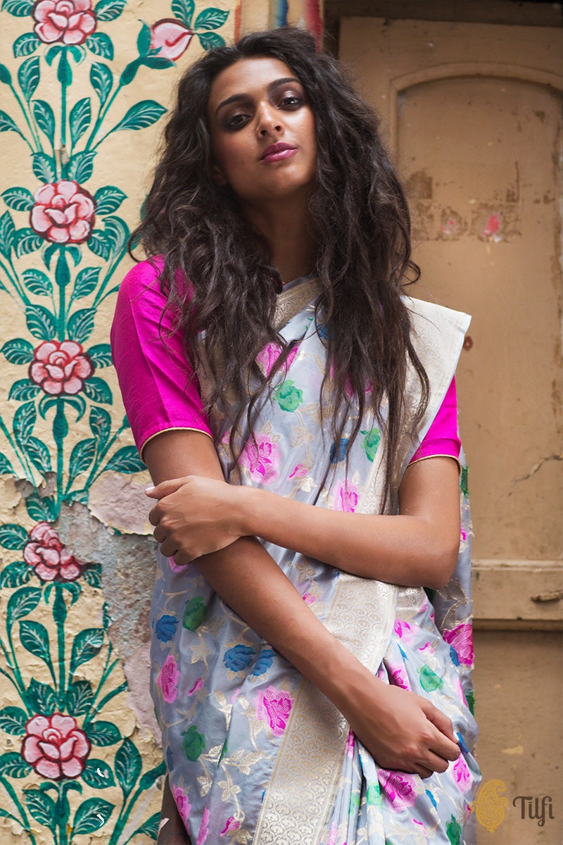 Adana - a grand rendition. Stop and take a minute to admire the beauty of this floral Tilfi Meenakari jaal saree! The restrained beauty of Katan Silk and the splendour of handcrafted zari and Meenakari flowers...a match made in Banaras.