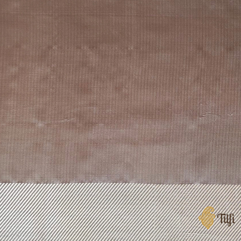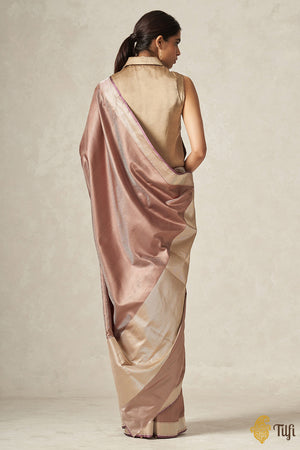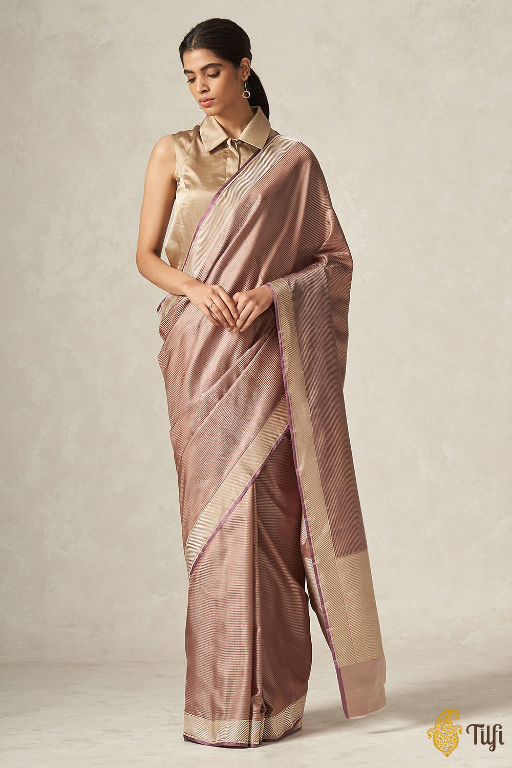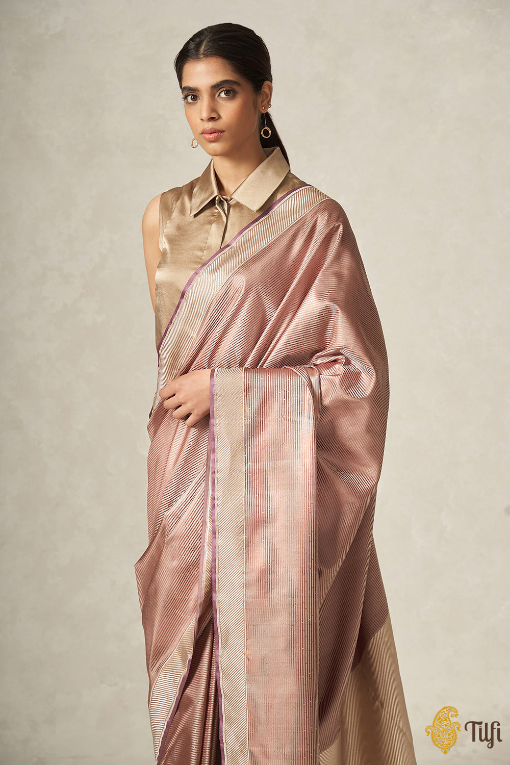 A sleek satin silk saree covered with an understated striped pattern alluding to the geometry of Art Deco. A soft and versatile drape handwoven in the fine Tanchoi technique.