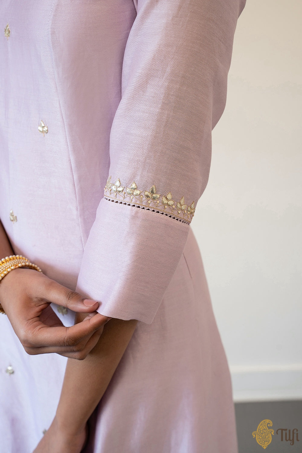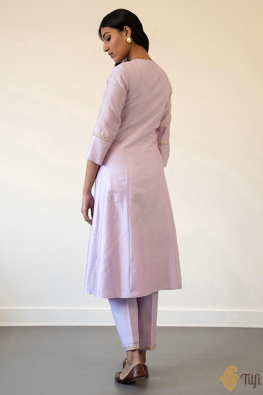 A festive Chanderi suit set with delicate hand-embroidered florals in classical gota patti style. With its traditional silhouette and dainty patterning, it is certain to become your go-to ensemble.