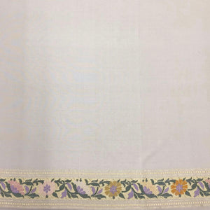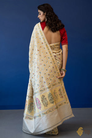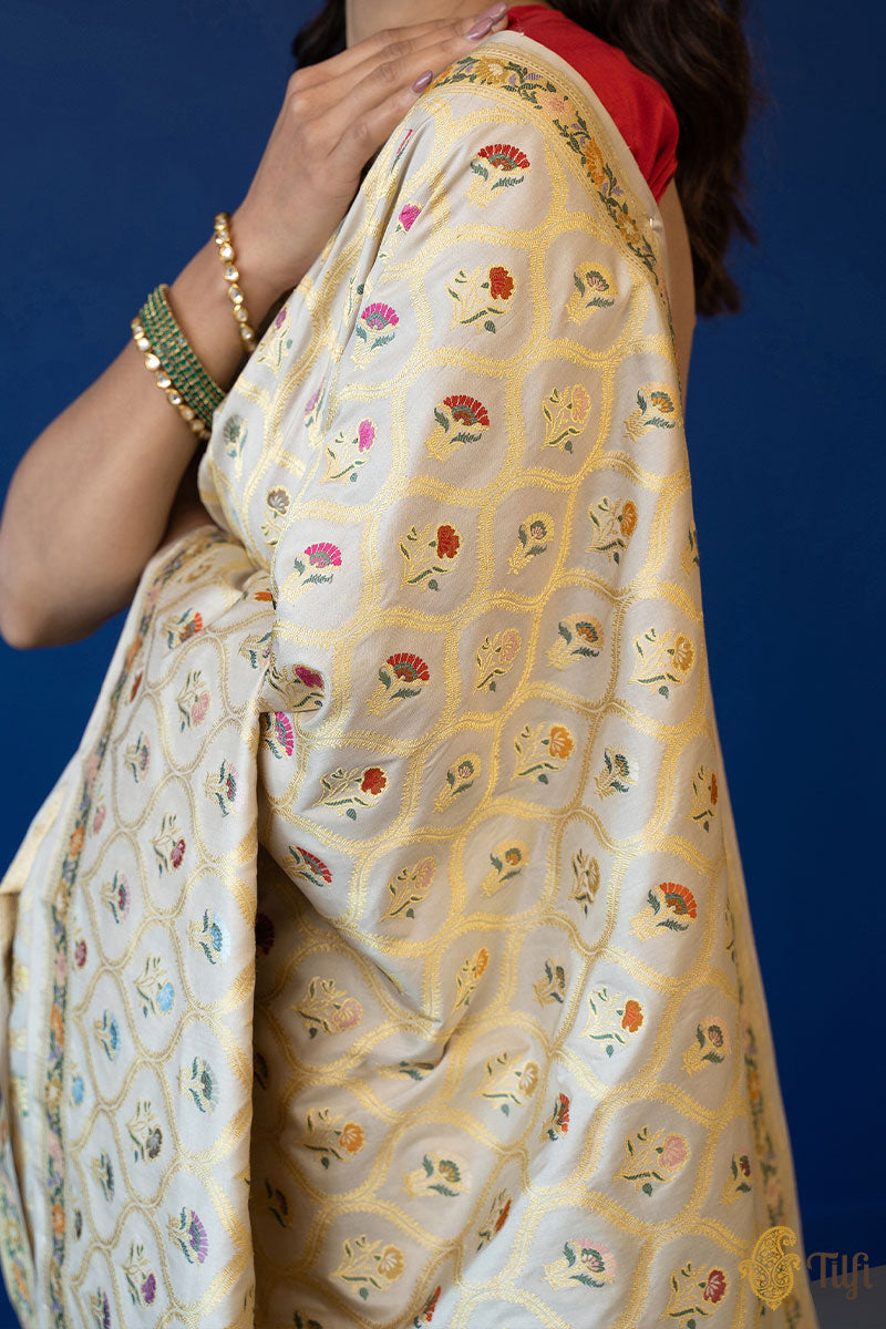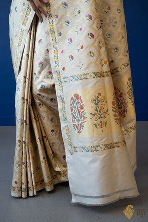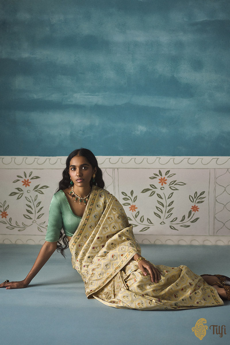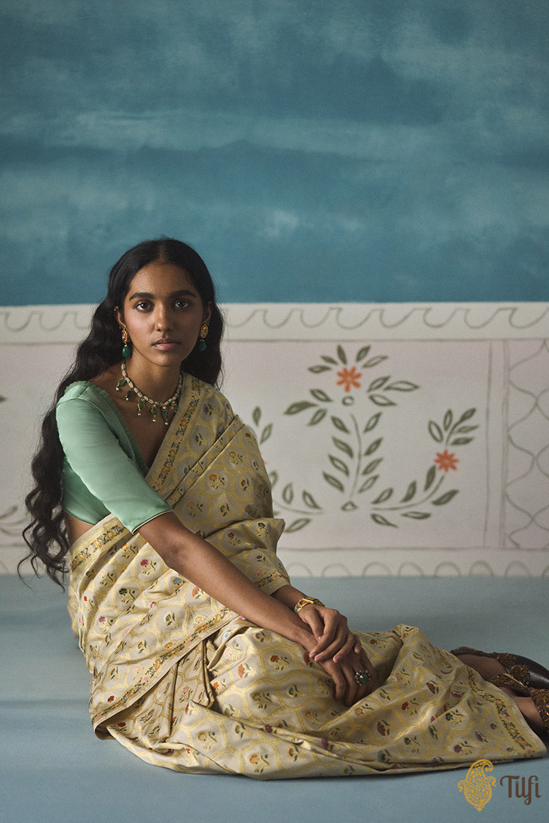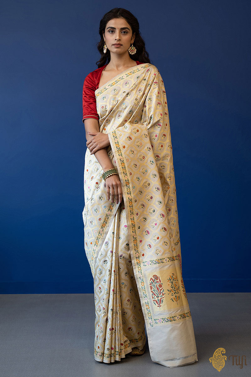 An extremely nuanced piece of art, evocative of the incredible intricacy of Mughal miniature paintings. Valuing colour balance, precision and minute detail, this meticulously handwoven Banarasi drape builds on and celebrates our enchanting legacy of heritage craftsmanship. Featuring beautiful floral motifs, encased in an opulent roopa sona zari jaal and breathtaking multi-coloured meenakari, this saree is an evergreen handloom marvel.