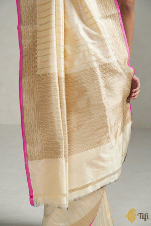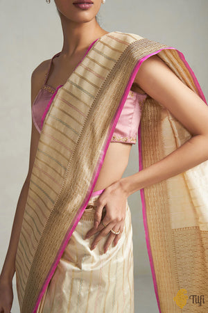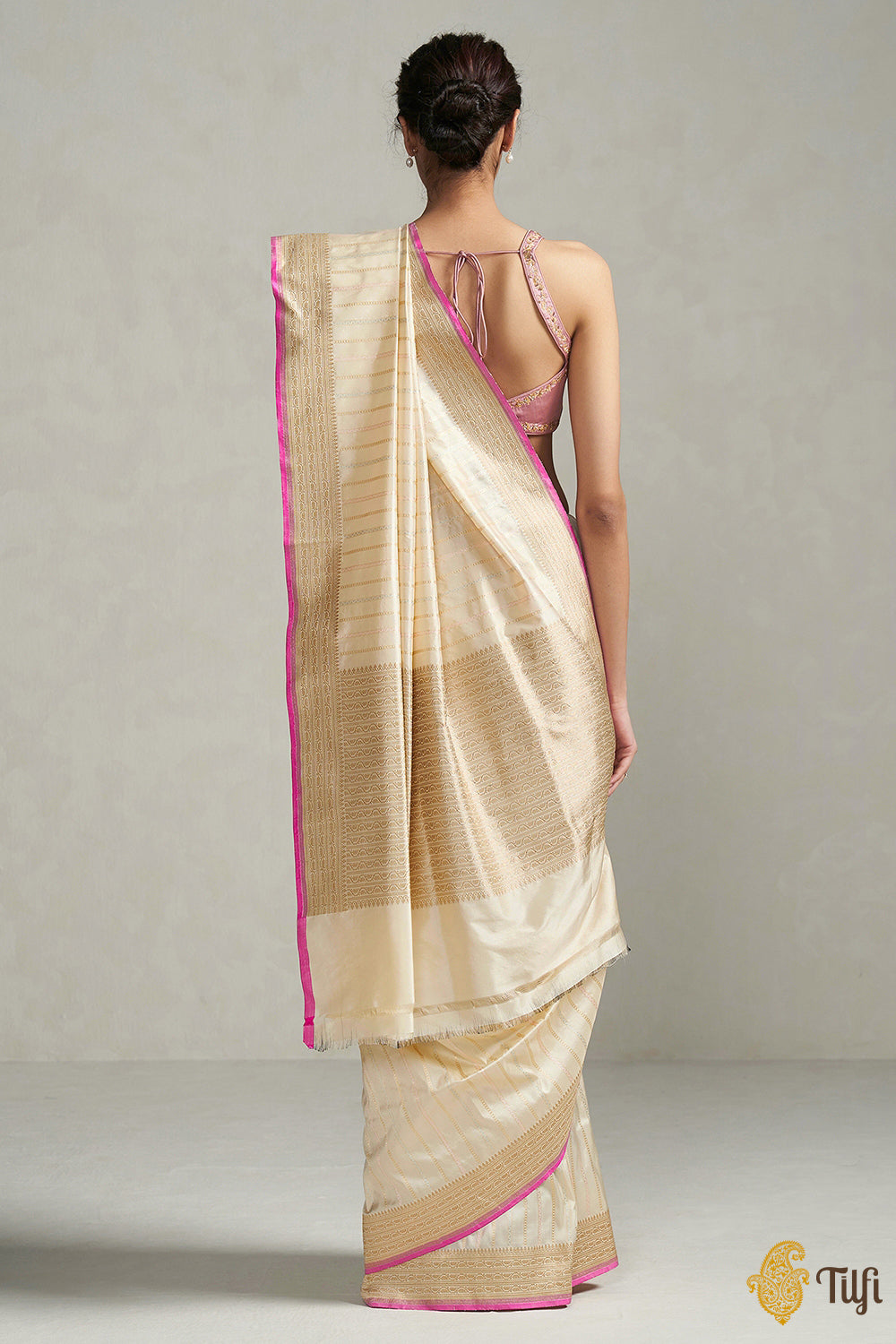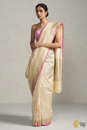 A chic and entirely fabulous Banarasi classic. It has a delightful striped weave in zari and meenakari and a gorgeous kadhua border. An instant favourite.